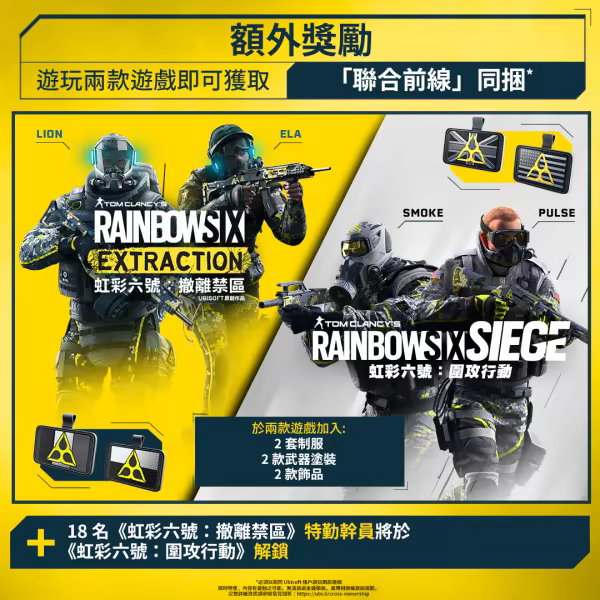 •《虹彩六號:圍攻行動》玩家可在兩款遊戲取得 4 套獨家史詩裝備組,並在《虹彩六號:圍攻行動》中立即解鎖 18 名於《虹彩六號:撤離禁區》登場的特勤幹員。