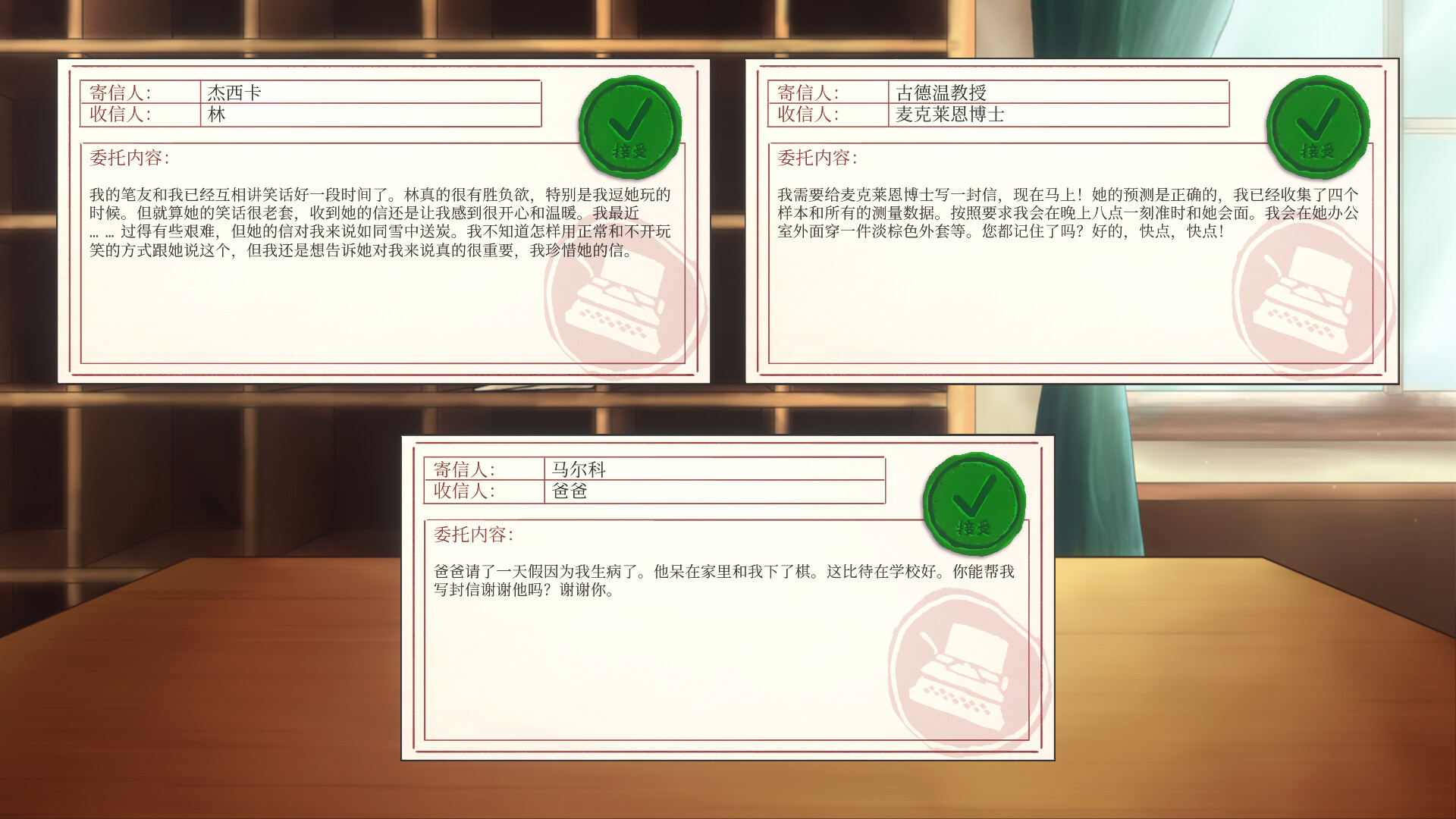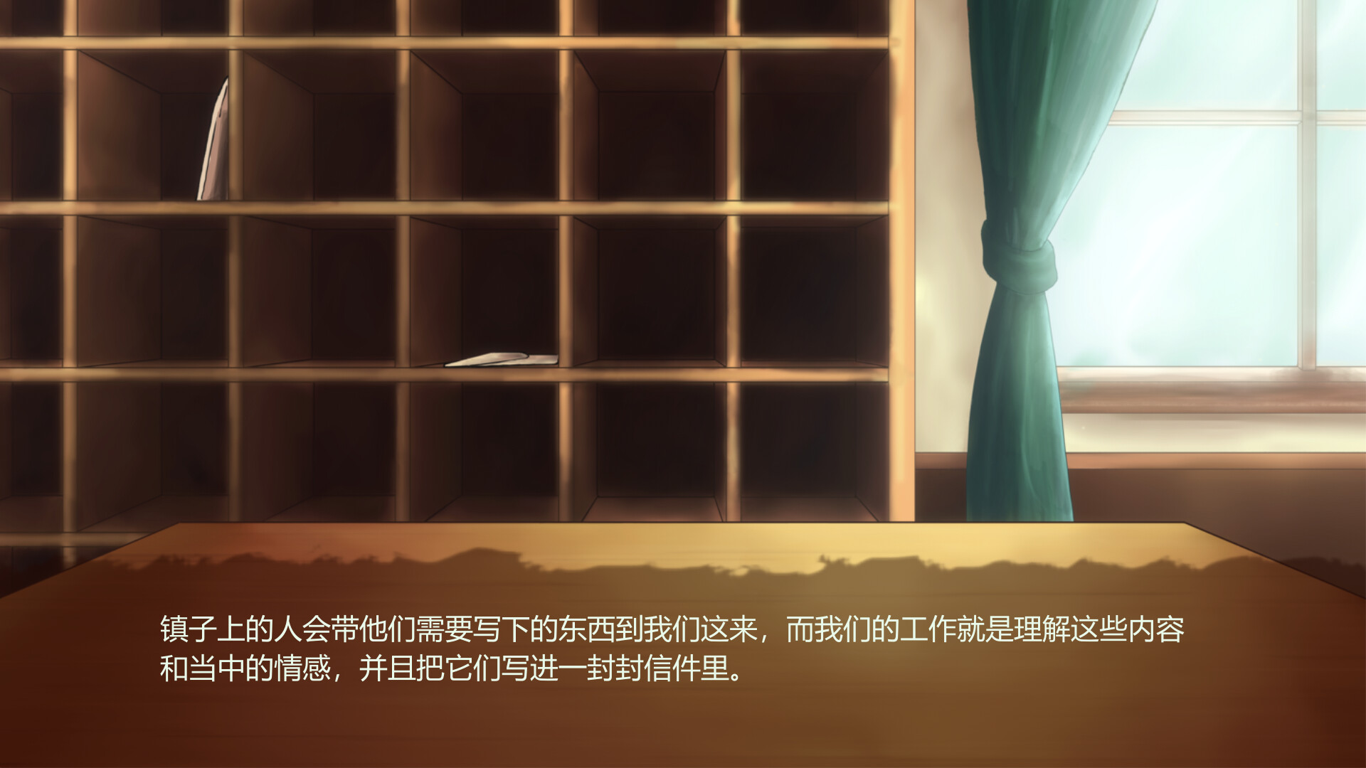 自由地在打字机上工作,体验你代笔人这份新工作的第一天。从委托人那接受各式各样的委托,不管是日常寒暄还是撰写情书或剧本,将他们想传达的信息和感受融入到信件中吧。当你写信的时候,去理清那交织在众多委托中的故事;在逐渐熟悉打字机的脾气的同时,去找寻写信对你自己的意义。