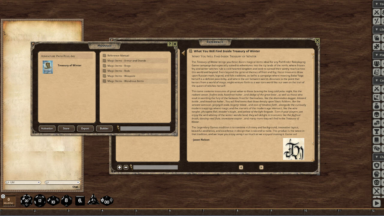 Requires: The free Fantasy Grounds virtual tabletop (VTT) software and the included Pathfinder RPG and D&D 3.5/ OGL ruleset.