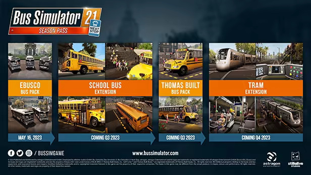 Découvrez l'expérience ultime pour Bus Simulator 21 Next Stop avec notre nouvel abonnement saisonnier. Celui-ci vous permettra d'accéder automatiquement à tous les futurs DLC payants comme le nouveau Pack de bus Ebusco comprenant 3 nouveaux bus électriques. Vous obtiendrez aussi l'extension Bus scolaire, le Pack de bus Thomas Built et l'extension Tram. Cet ensemble intégral vous permet d'économiser plus de 40 % sur le prix en achetant chaque article individuellement !