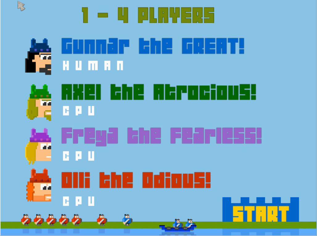 Choose from Gunnar the Great, Freya the Fearless, Axel the Atrocious, Olli the Odious, and then fight against your opponents