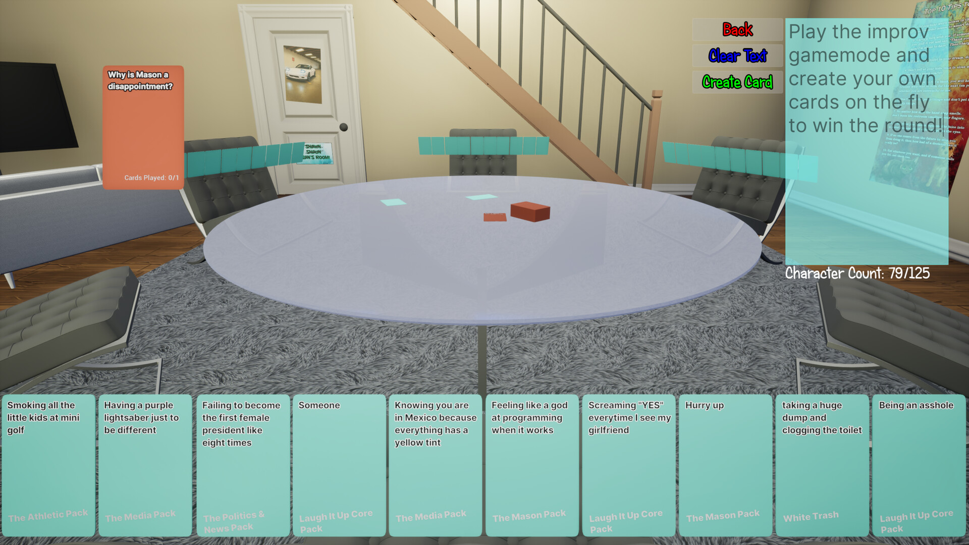 Laugh It Up is a labor of love made by two buddies in our free-time. It has been our dream getting to work on this game but we want to add more! We want you, the player to be able to share your hilarious (or dumb depending on how people see your sense of humor) custom decks with everyone through Steam Workshop. We want to port the game over to Mac, that way you can play with your loser Mac friends. If our game is popular enough we will add this and more for free! So here is our roadmap that we will update!