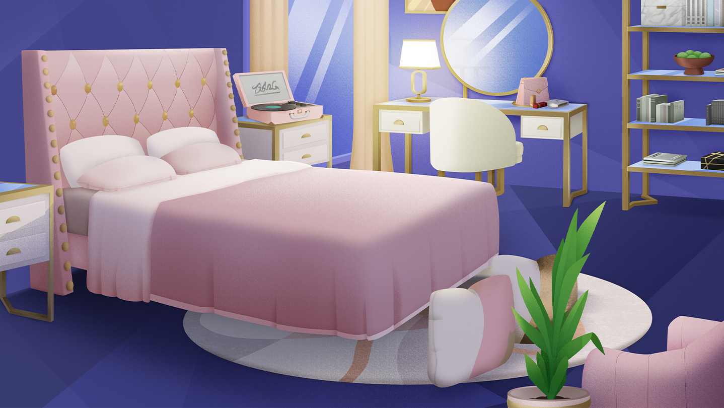 • Bedroom Bliss — Design a stylish and inviting space with high-end pieces like a lavish bed with a tufted headboard, a vanity, a plush rug, and other decadent details.
