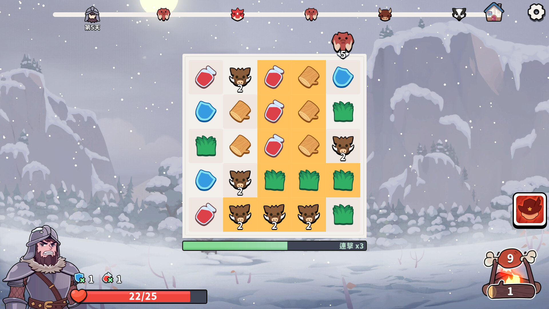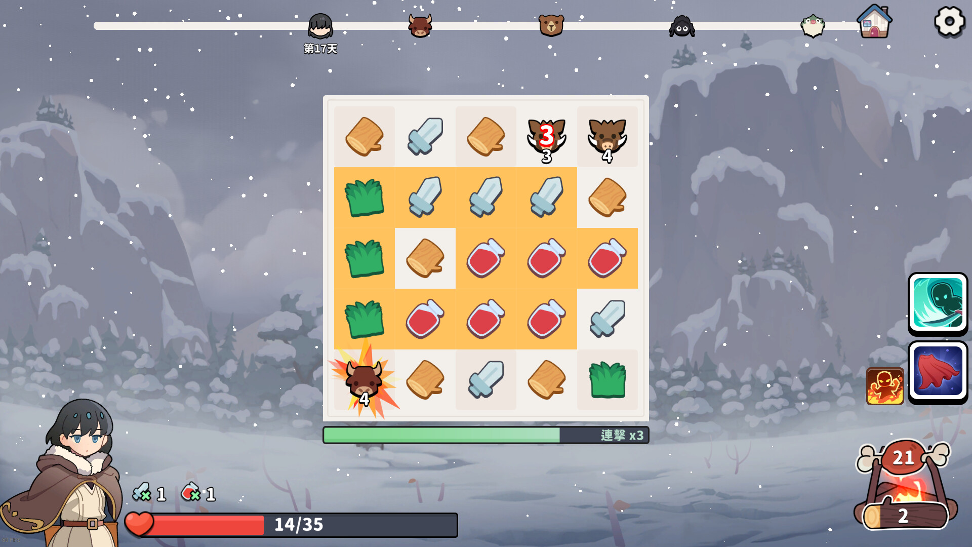 《冬獵》是一款類Rogue三消遊戲。通過匹配棋子狩獵野獸,收集柴火,不斷變強。設法存活60天便能取得遊戲勝利!