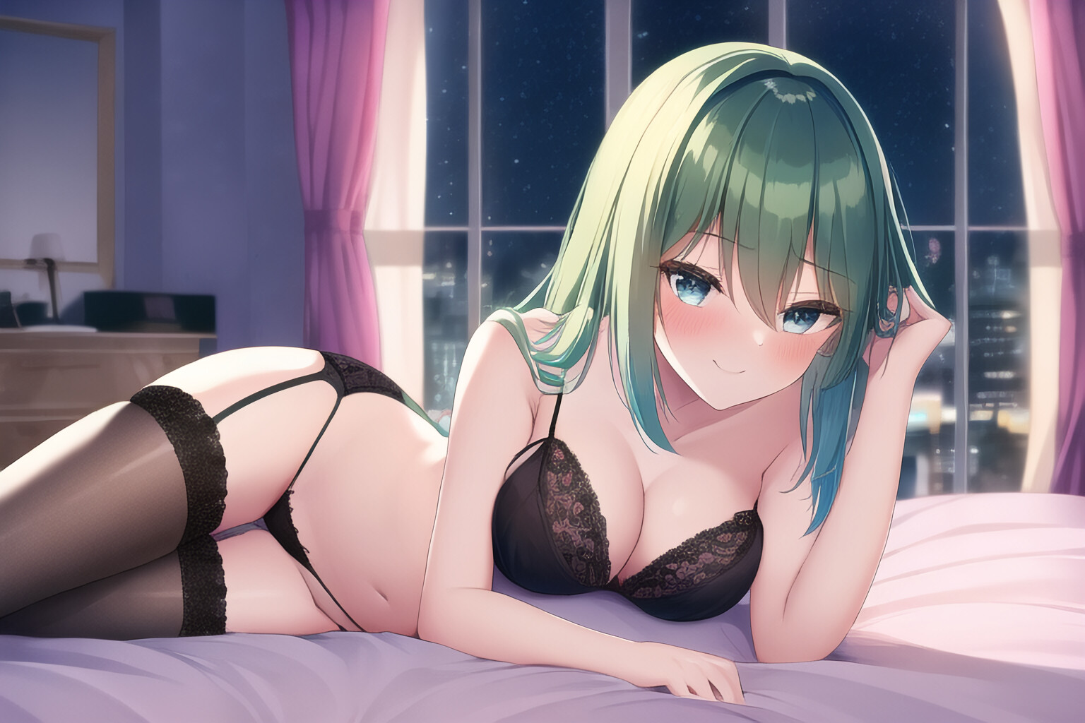 Partially-veiled nudity (nude, but censored breasts and midsection with hair, steam, furniture, etc.)