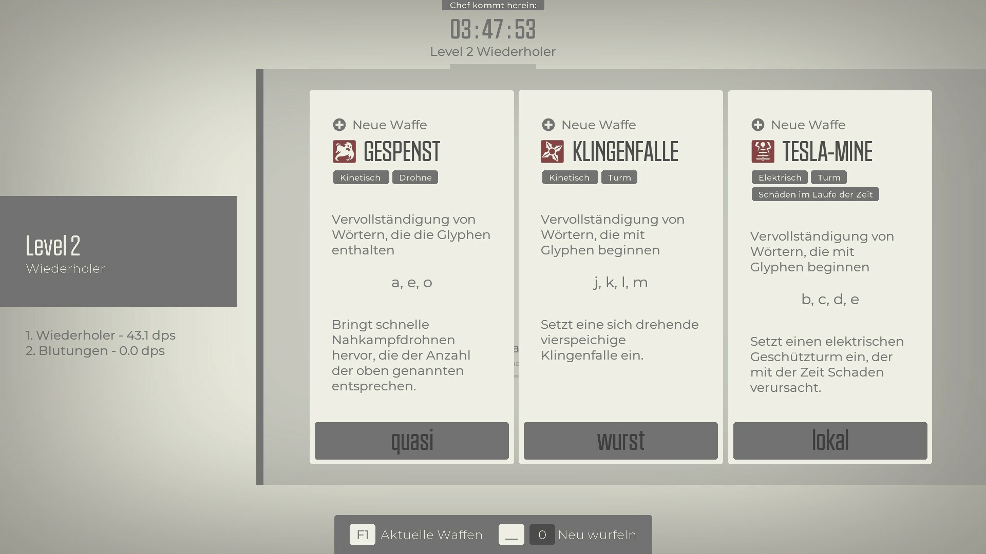 In diesem rasanten Spiel, das deine Schnelligkeit, Genauigkeit und Strategie herausfordert, trifft Tippen lernen auf das Überleben von Horden an Gegnern. Betritt eine minimalistische Arena und dominiere das Schlachtfeld mit deinen Tippfähigkeiten und deiner zuverlässigen Tastatur.