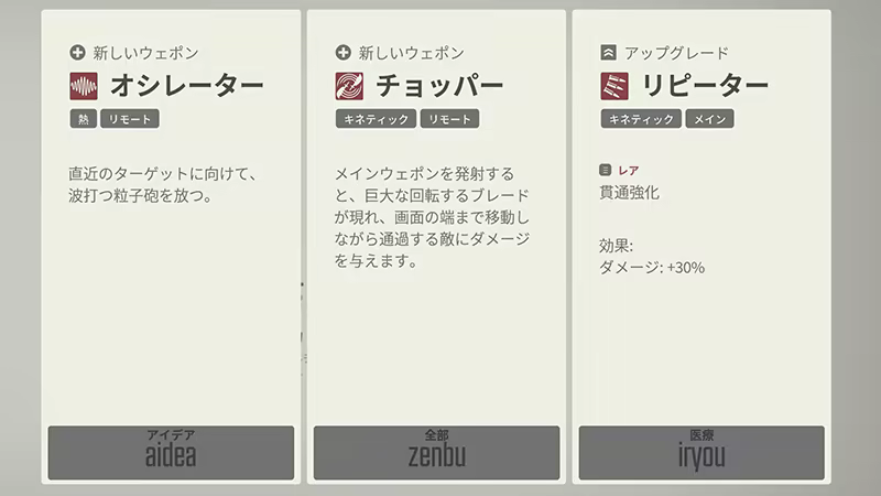 自分専用のビルドを作りましょう。オシレーターやセントリーを配置して広範囲をカバーしながら残敵を排除したり、メインウェポンを選択を極限まで最適化してアルファベットの暗殺機に進化させたり。選択は自由です!