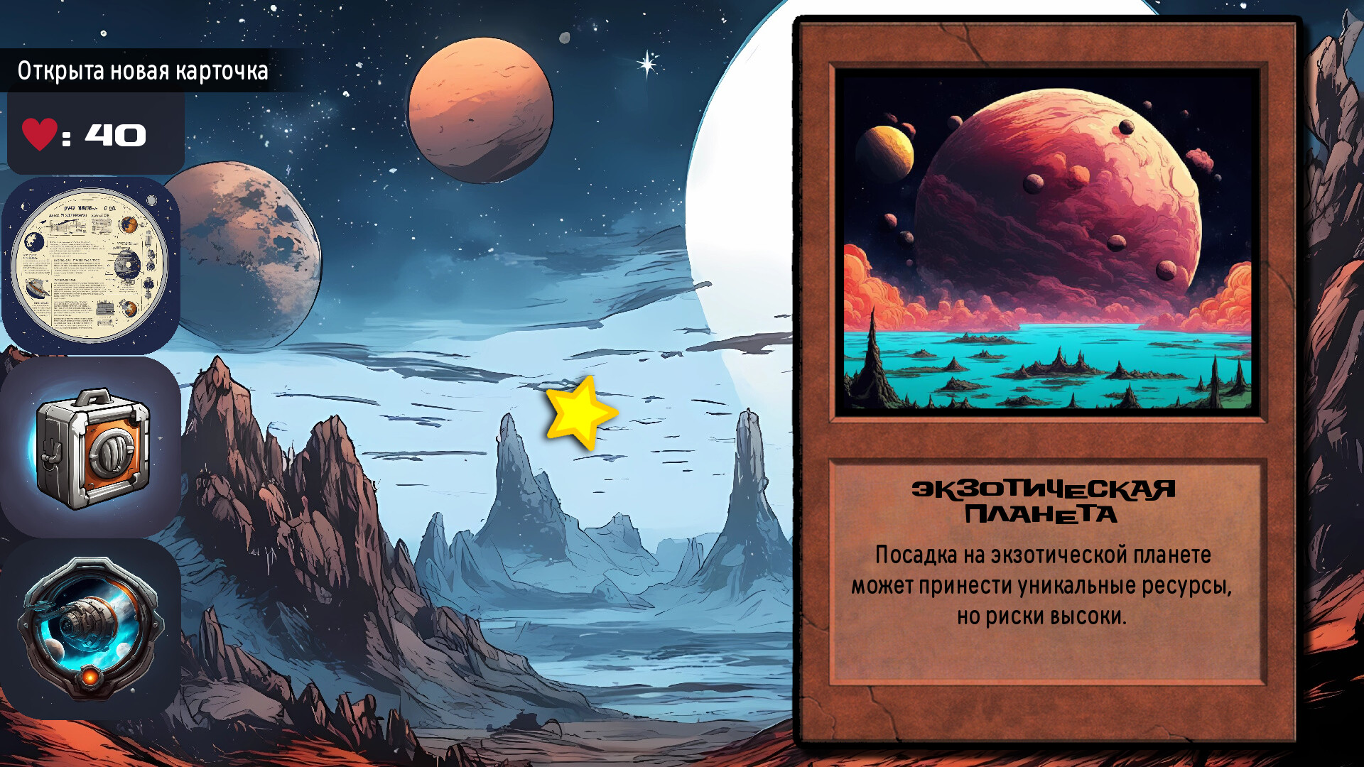 Исследуйте невероятные локации, вытягивая случайные карты и принимая стратегические решения на пути к победе. В этой космической карточной игре вас ждут увлекательные сражения, захватывающие приключения и волнующие открытия.