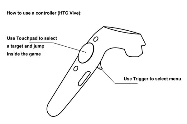 How to use a controller (HTC Vive): Use Trigger to select menu. Use Touchpad to select a target and jump inside the game.