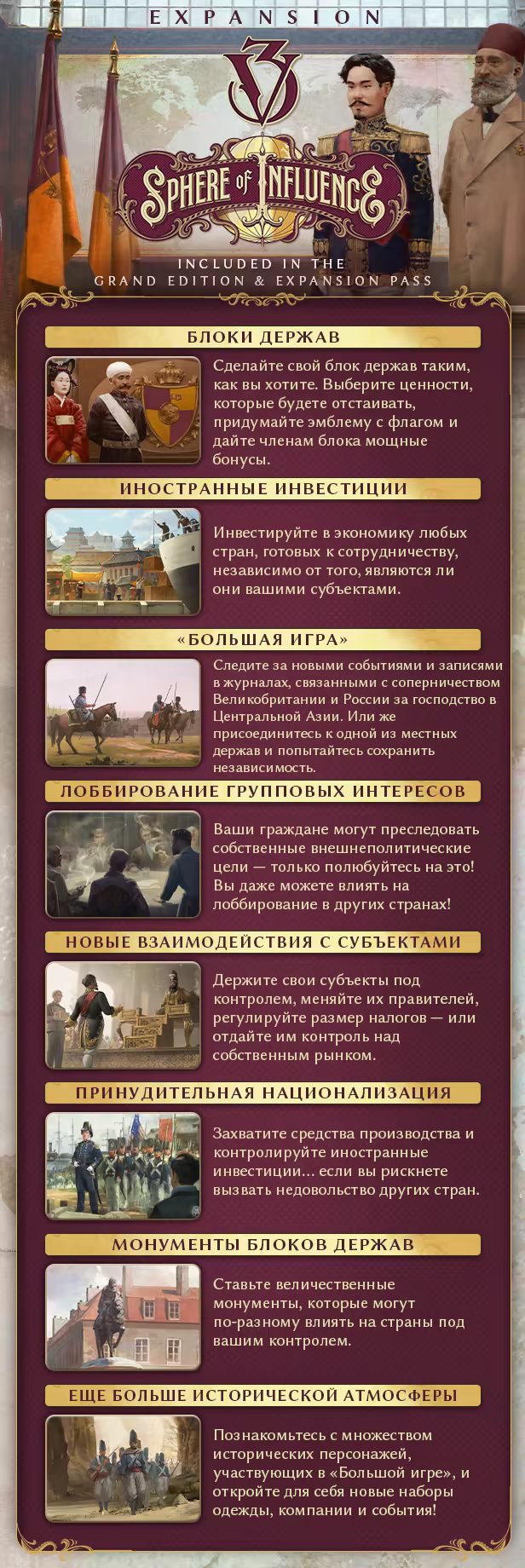 Sphere of Influence добавляет множество новых действий и систем, иллюстрирующих быстро меняющийся характер дипломатических отношений в эту напряженную эпоху. В частности, вас ждет новый контент, посвященный «Большой игре» — многолетнему соперничеству между Британской и Российской империями за господство в Северной Индии и Центральной Азии.