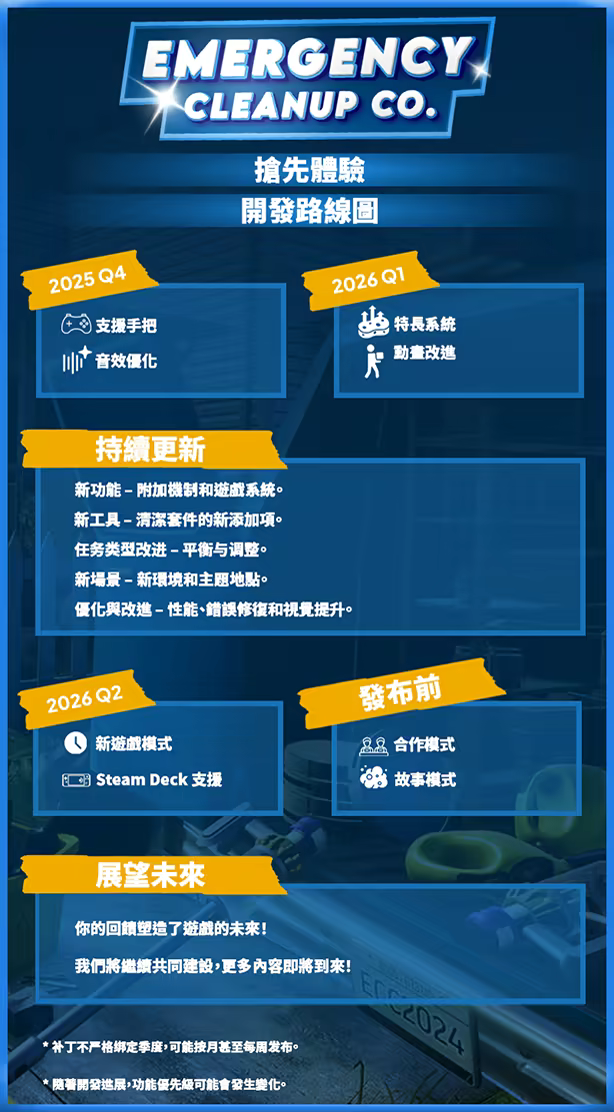 「我們計畫透過Discord和Steam社群收集玩家的反饋意見。回報遊戲中的錯誤並分享他們希望開發的功能將有助於我們改進遊戲品質。此外,我們將定期發布更新和開發者部落格,與社群互動,分享遊戲開發進展。」