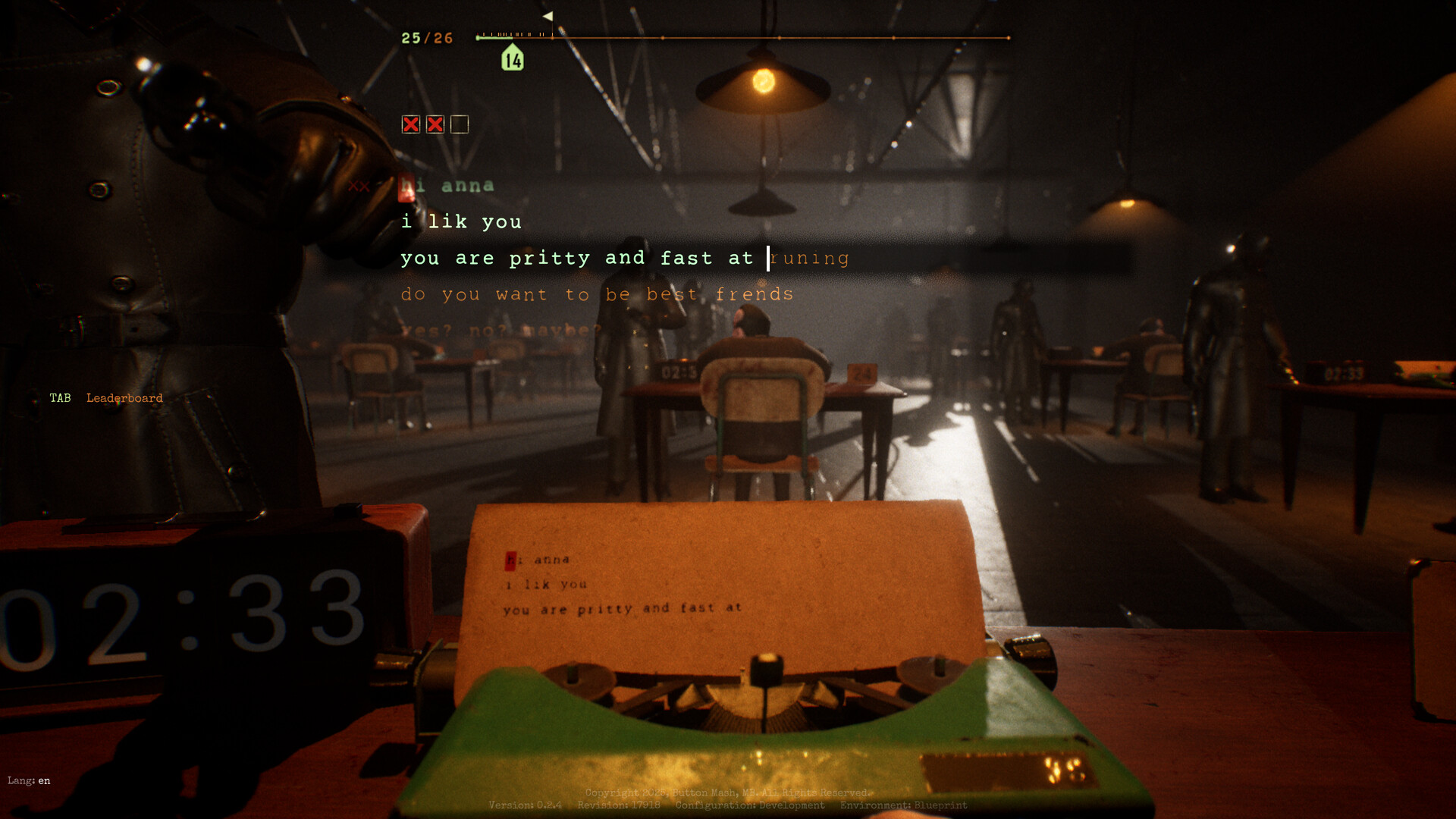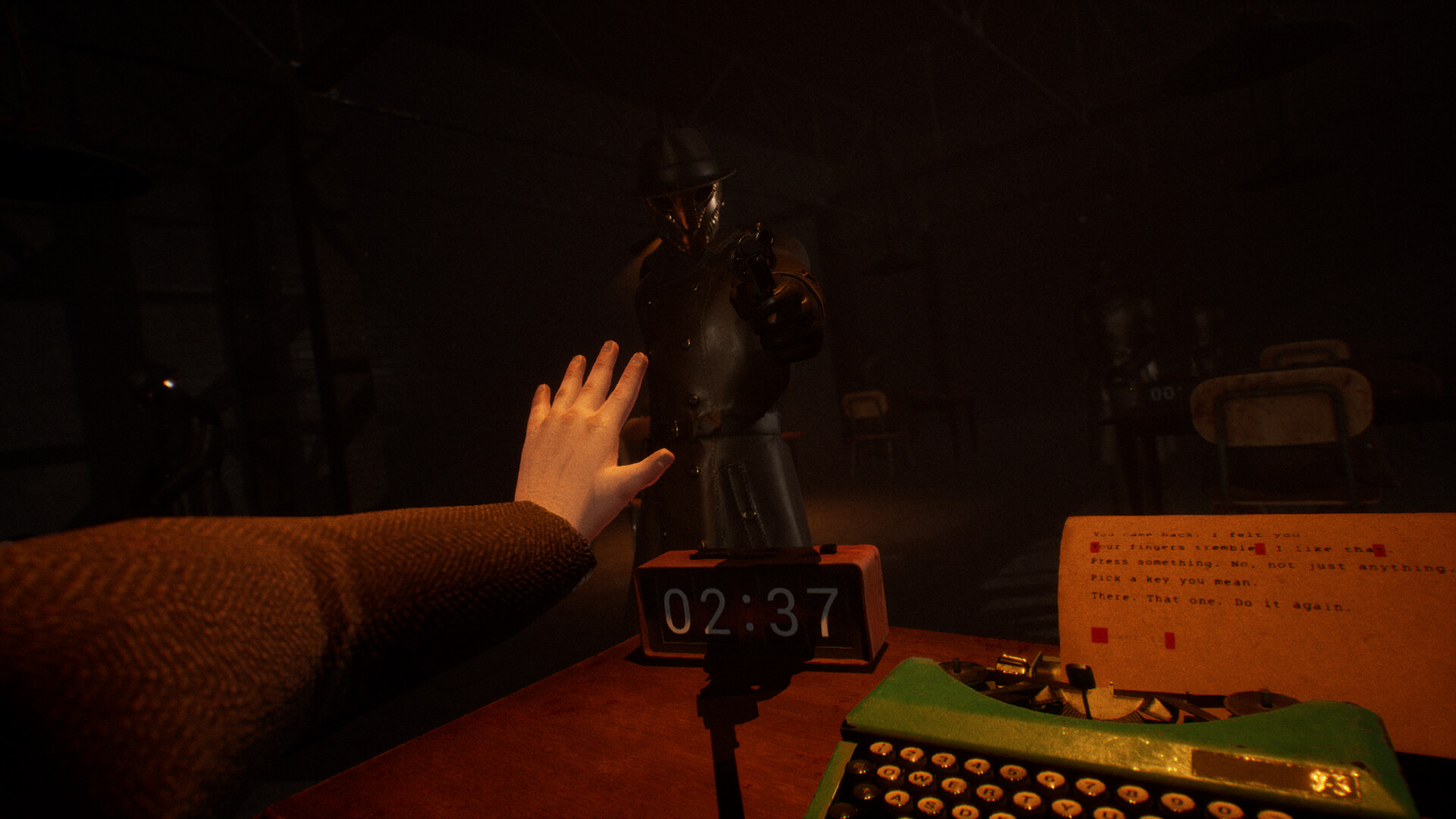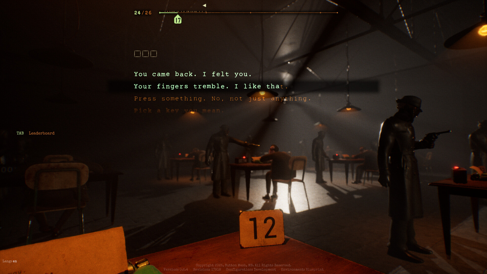Final Sentence is a Battle Royale typing game. Together with other players, you find yourself in a hangar, with a typewriter in front of you and a revolver loaded with a single bullet at your temple. Every mistake can be fatal. Only one will remain.