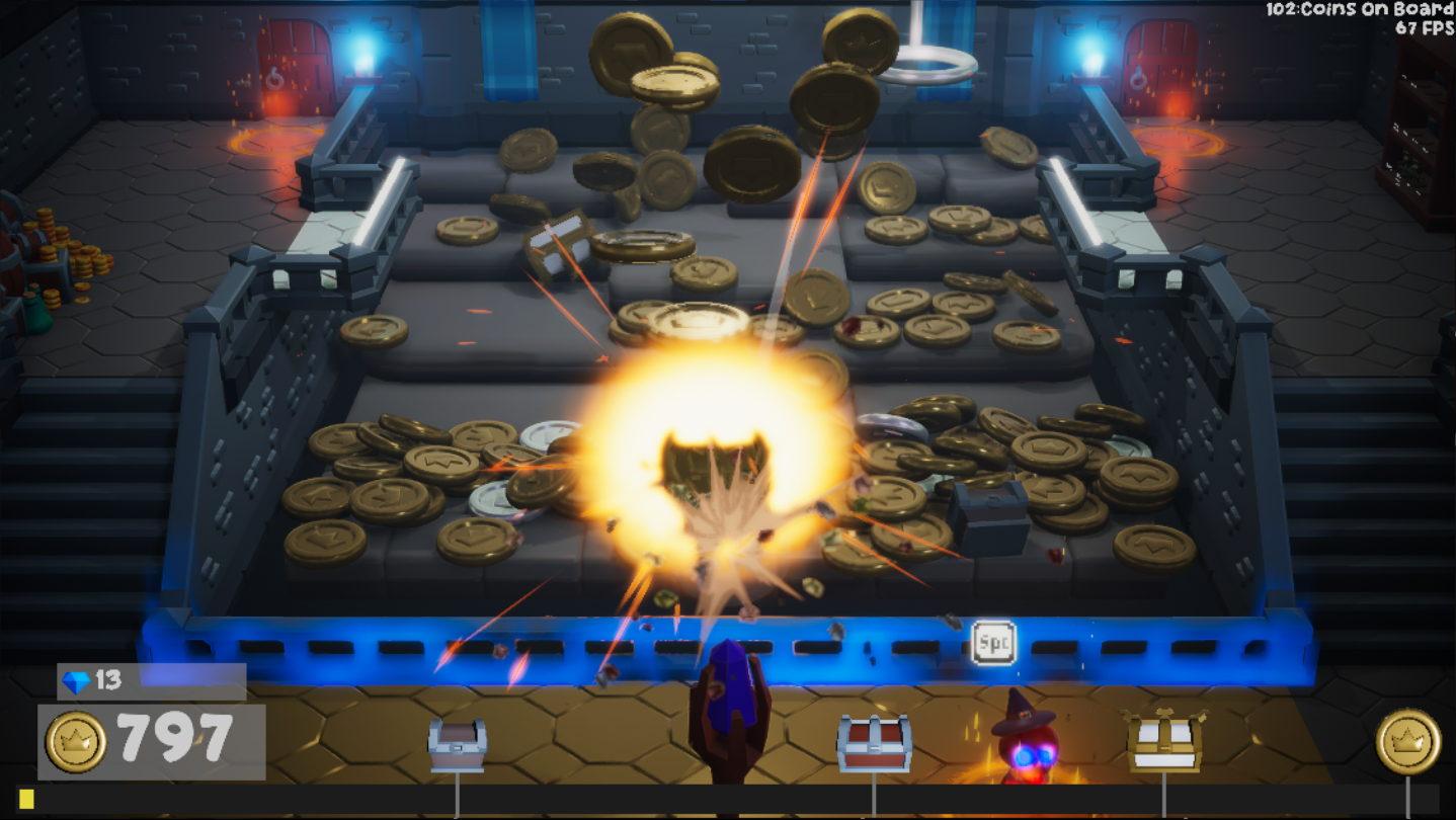 Explore 6 unique and meticulously crafted pusher tables, each with its own atmosphere and challenges. Push coins strategically and fight cool bosses.