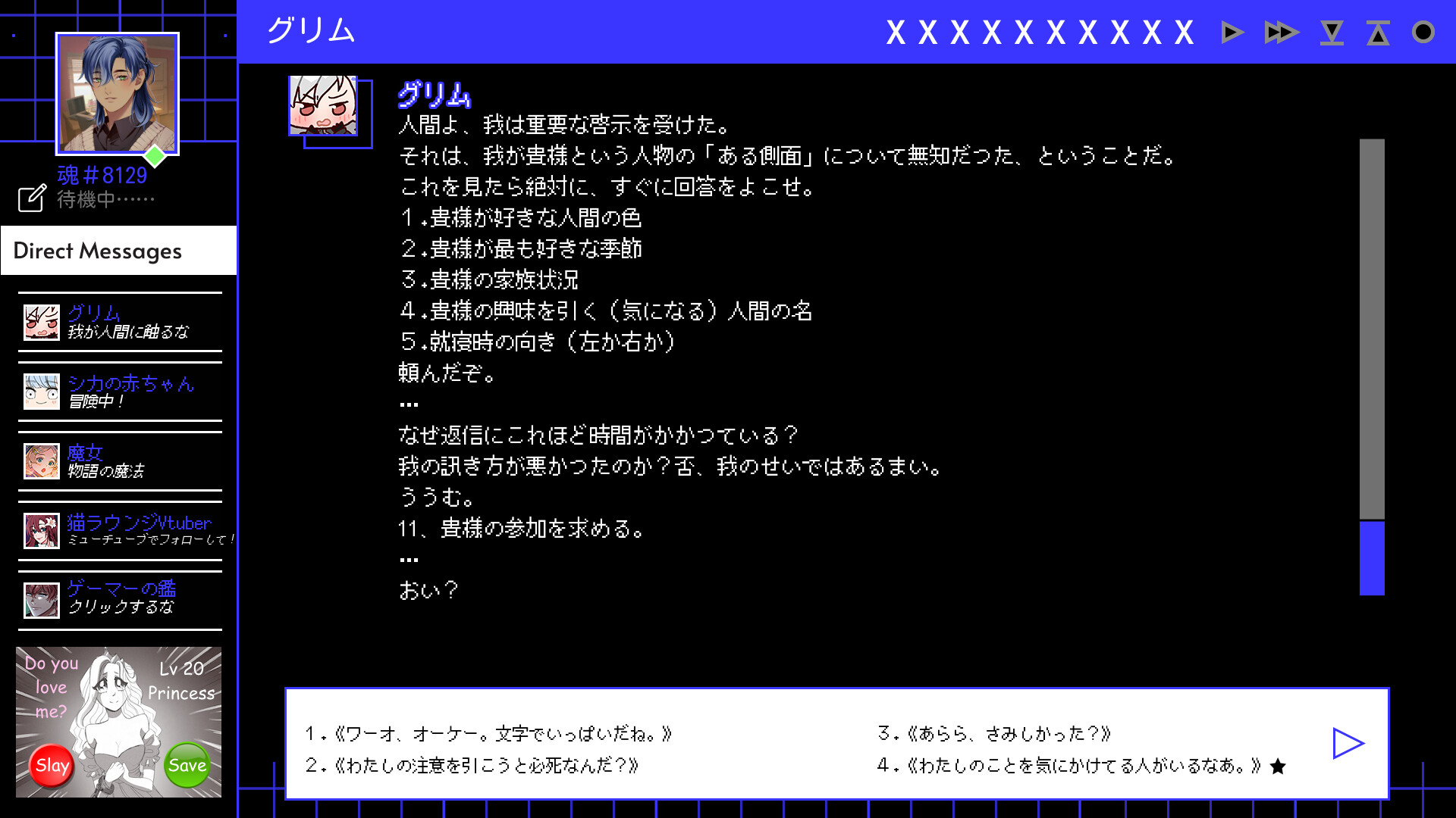 自分はごく普通の人間...そう、思っていた。今までの人生、何度もギリギリで死を回避してきた。それは本当に、ただの幸運だったのだろうか…? そんなある日、あなたのコンピューターに突如現れた奇妙なチャットアプリ。「死神」と名乗る謎の男は、魂を奪いにやってきたと告げる——。その日から、あなたの人生は一変する。