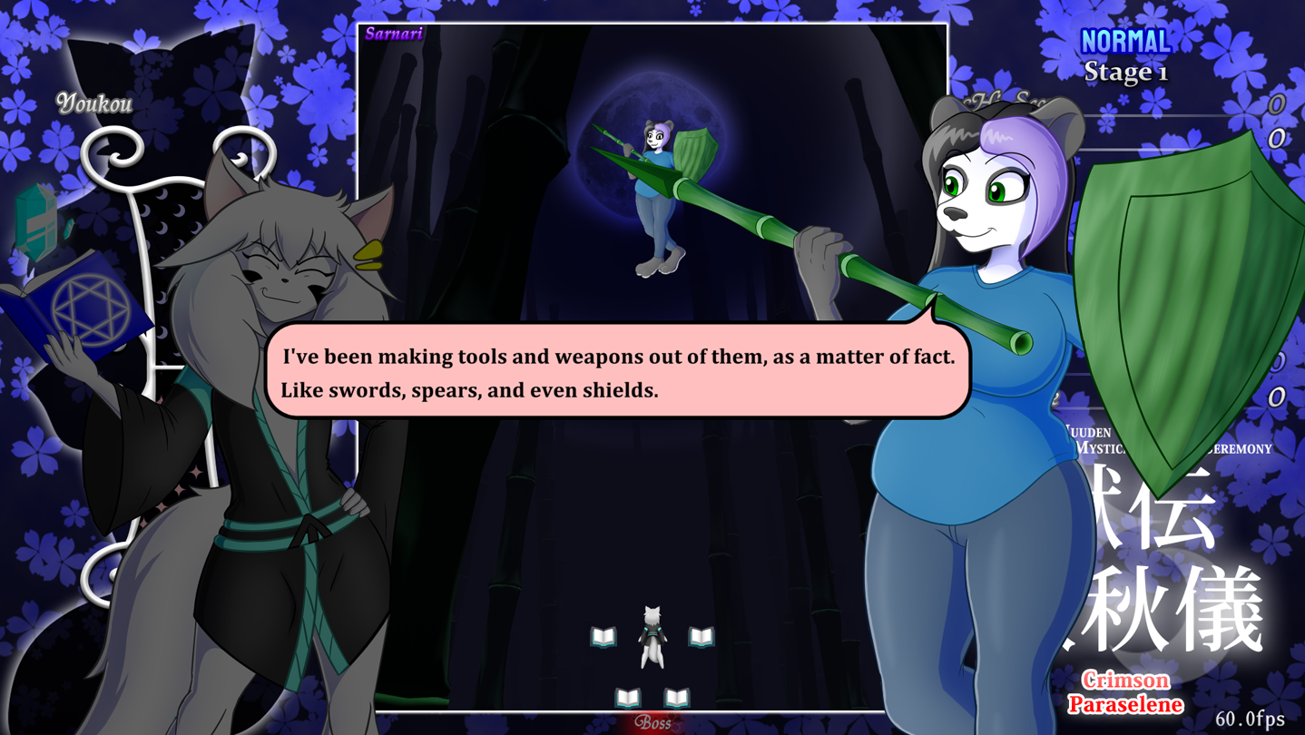 Juuden Youshuugi ~ Crimson Paraselene (獣伝妖秋儀 ~ Crimson Paraselene) is a bullet hell shooting game inspired by Touhou Project, featuring characters from various artists. The game takes place in Lunamara, a mystical land where the moon is closest to the Earth, inhabited by beasts, magic users, and youkai.