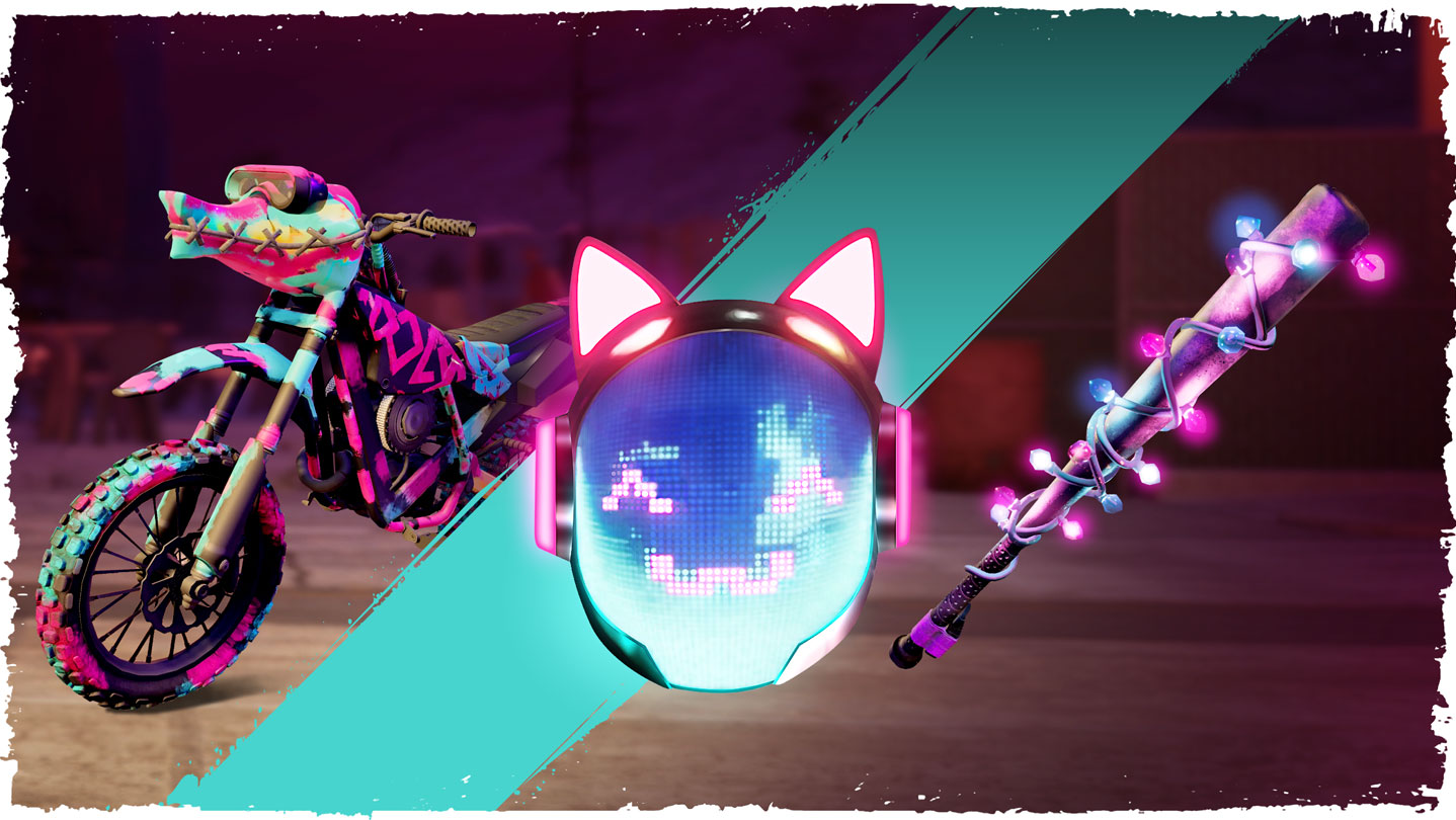 Iklæd dig den ikoniske, digitaliserede dj-hjelm, så du kan oplyse fjendens ansigter, før du slår dem bevidstløse med Idols Twinkle Bat til lyden af knust glas, før du suser væk på din stjålne, neonoplyste Sandstorm Scrambler bike.