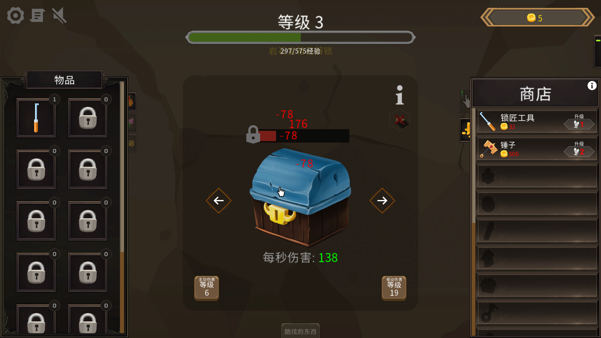 从脆弱的木宝箱到强大的金宝箱,“宝箱点击器”展示了总共 40 个宝箱。随着进展,每个宝箱变得越来越难以打开,但奖励也变得更诱人。每个宝箱的打开都会授予您特定数量的金币。还将从每个宝箱中获得经验值,并积累足够的经验值将使您升级,并获得技能点!宝箱有小概率掉落宝藏,包括超级稀有的宝藏。像冒险的海盗一样收集所有稀有宝藏吧!