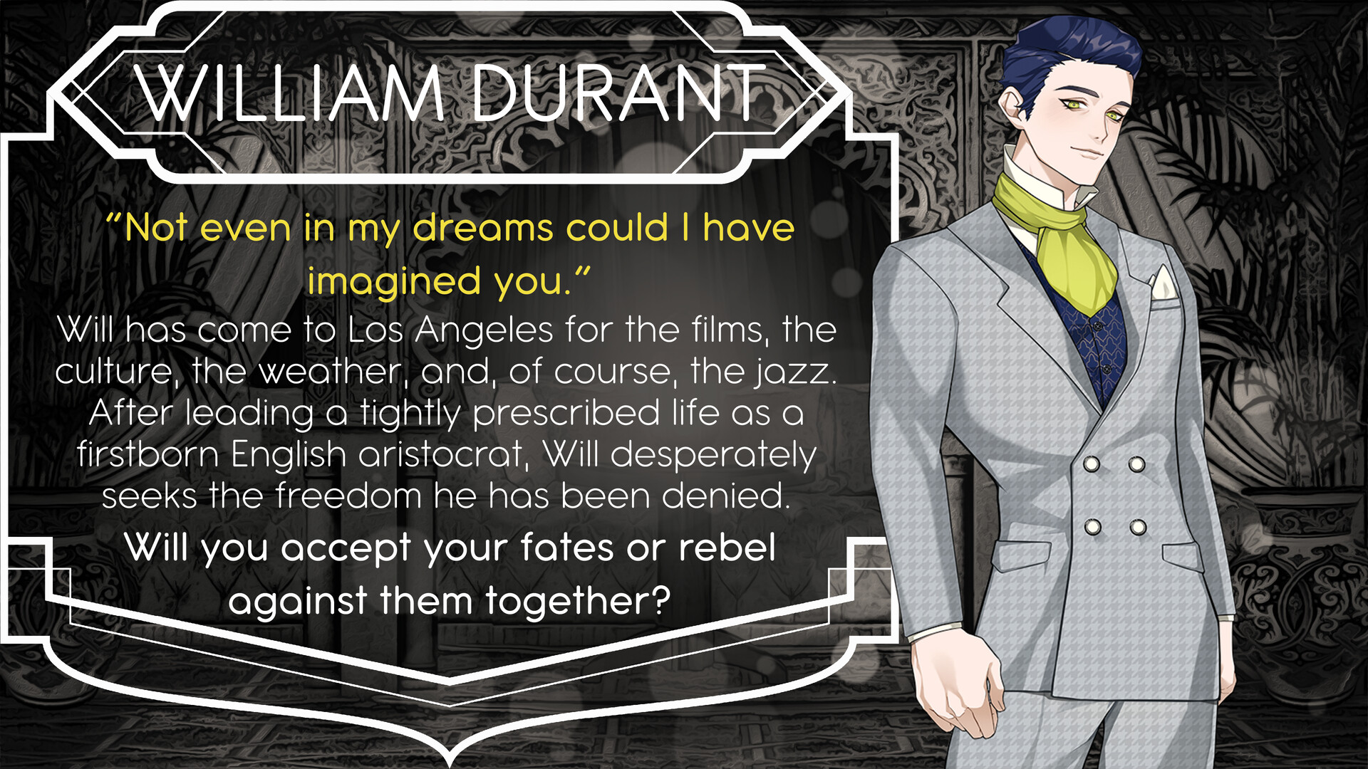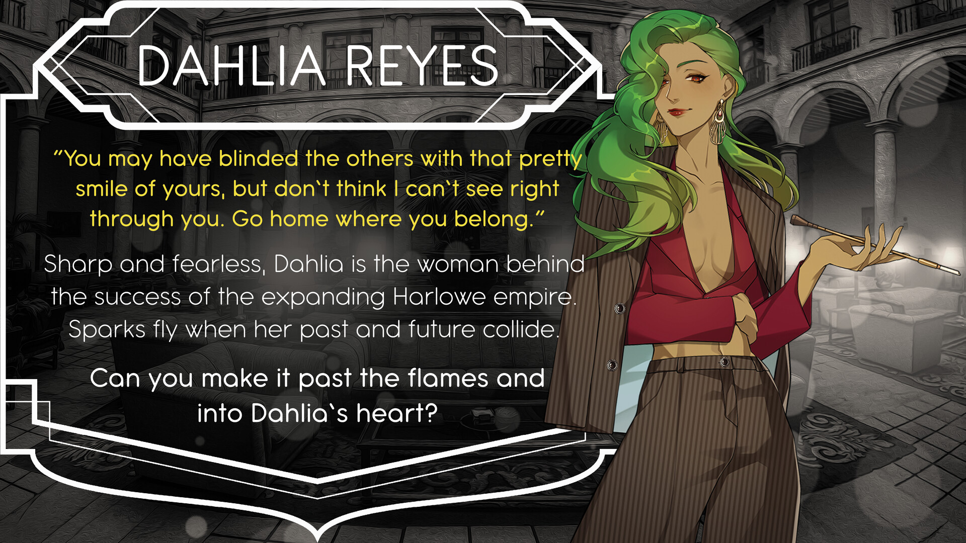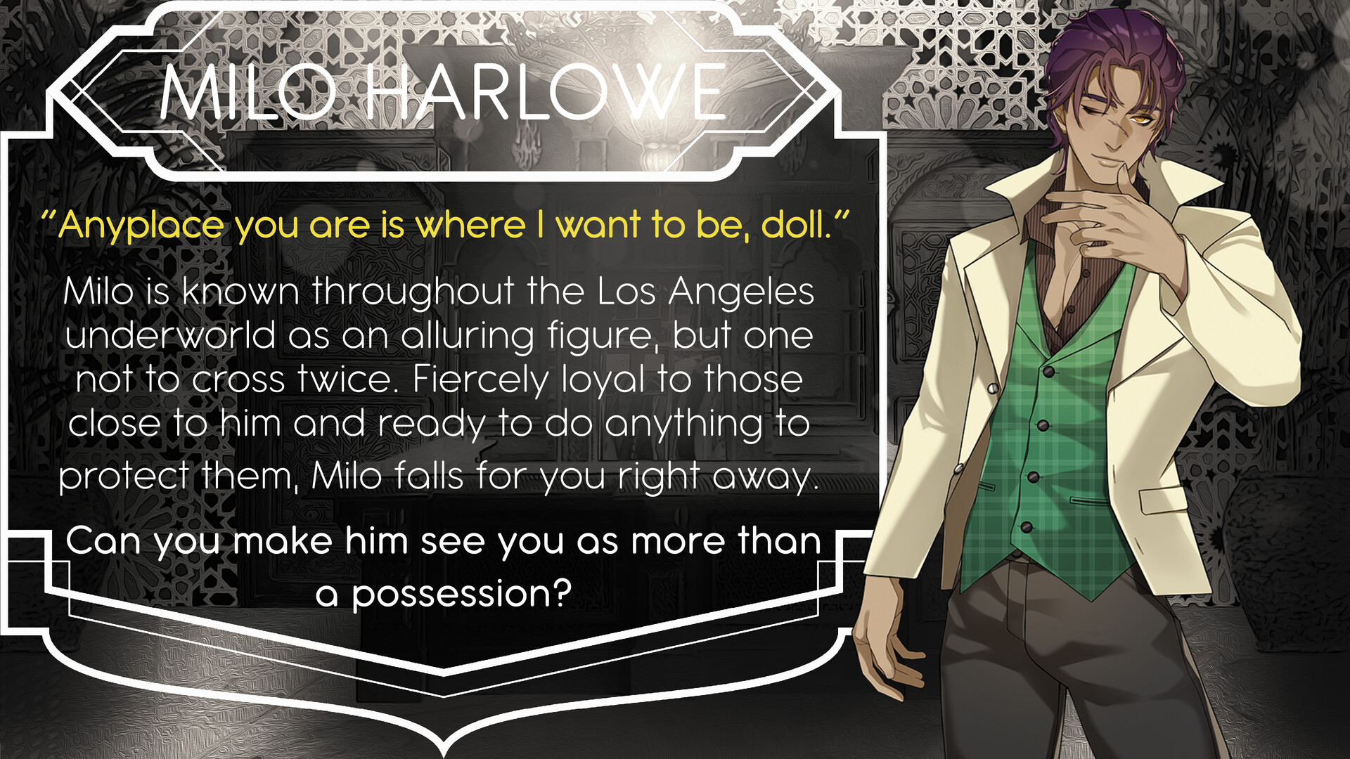 Join Cora West for a whirlwind of forbidden romances found in the depths of a decadent illegal jazz club in Prohibition-era Los Angeles. Decide if she can make it out with her heart intact or lose herself in the glamor and excess.