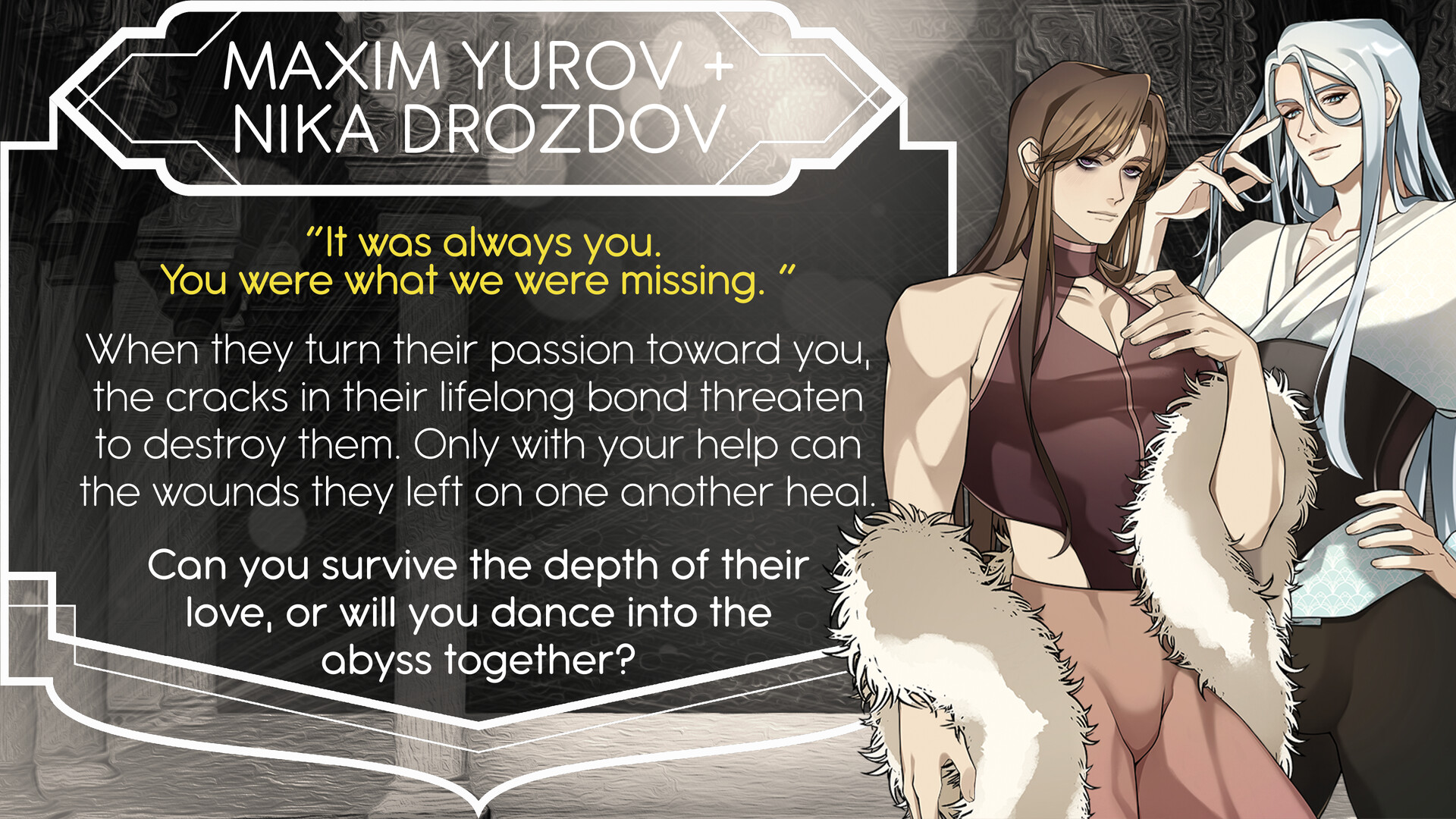 Within the game is a common route and six possible romance routes: four routes with single male love interests, one sapphic love interest, and one polyamorous route with two male love interests. All routes are unlocked at the start of the game and there is no requirement to complete certain routes to unlock others. Routes may be played in any order, but it's recommended to play Vincent Harlowe last.