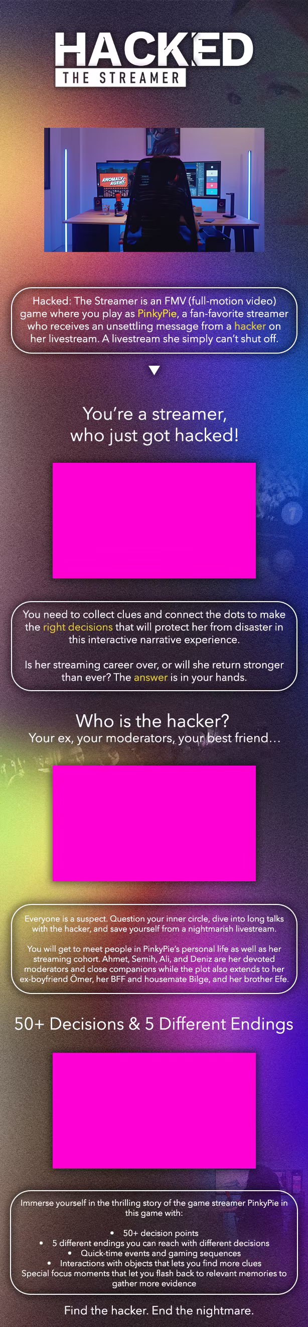 You are blackmailed in Hacked: The Streamer. Investigate clues, make impactful decisions, and shape your story to uncover the culprit is in this thrilling interactive movie. The fate of PinkyPie, a fan-favorite streamer, is in your hands.