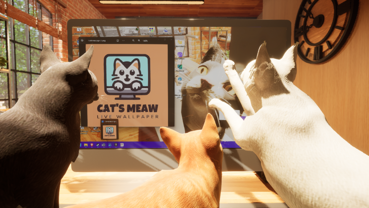 Transform your boring desktop wallpaper into a paradise for cats with `Cat's Meow Live Wallpaper`! Interact with cats on your desktop wallpaper and enjoy petting, playing, and dressing them up.