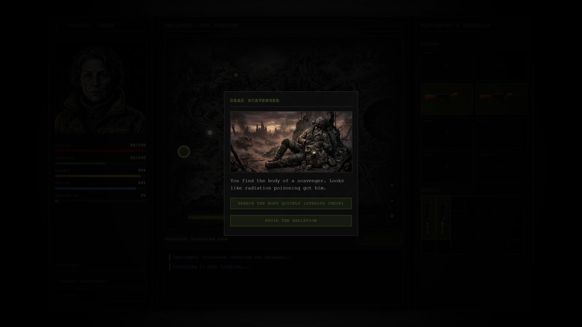 Scavenge the wasteland for food, weapons, and medical supplies. Decide what equipment to take... and what to leave behind. These tiny decisions can be the difference between life and death in a place like this...