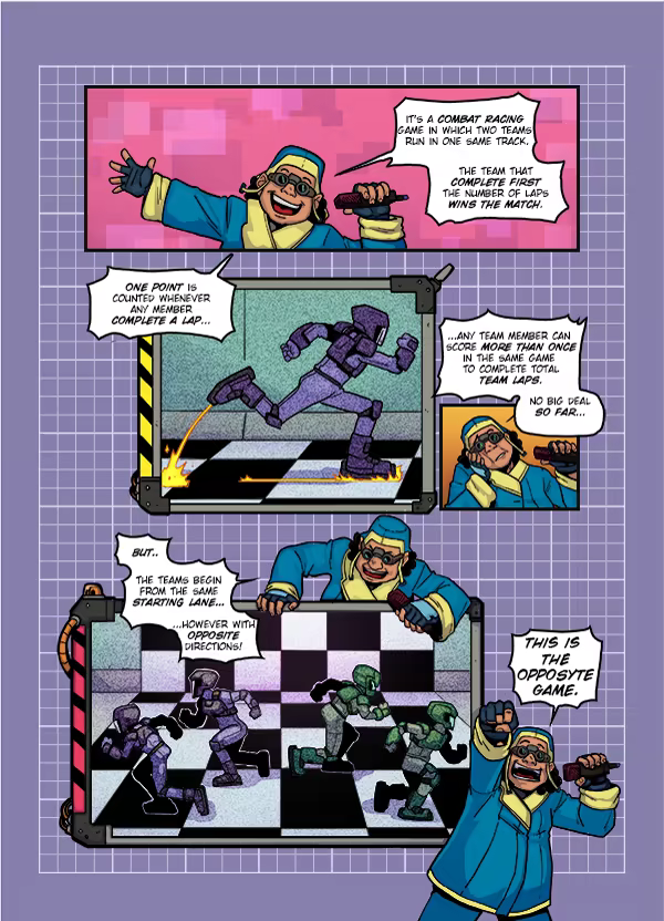 Have you ever imagined a race between teams starting from the same point, but with OPPOSITE DIRECTIONS? The encounter is inevitable. Survive your enemies, complete laps and score points for your team or strive to disrupt your opponents race. Choose the best strategy for your team.