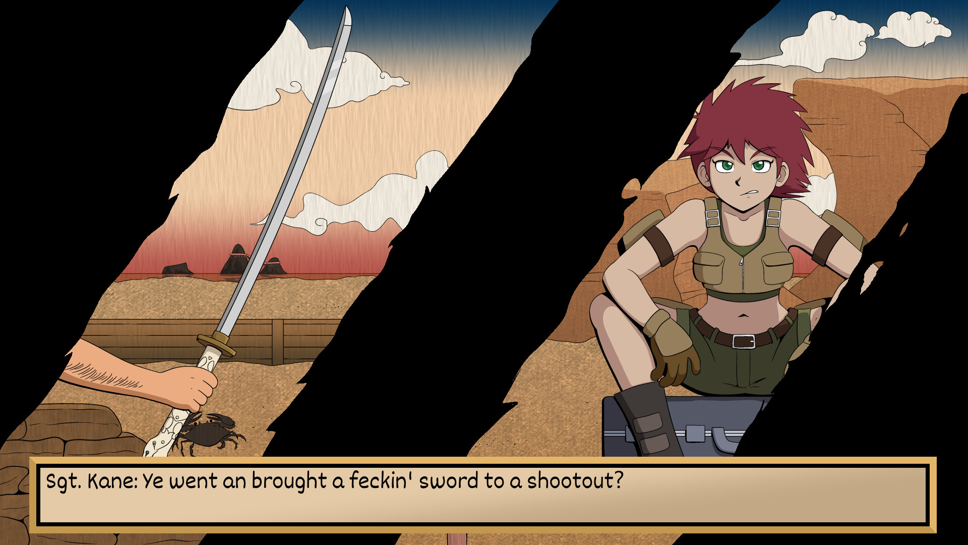 This wonderful nude beach has been invaded by a horde of women in admittingly fashionable swimsuits, so it's up to a lone naked samurai to enforce the undress code!