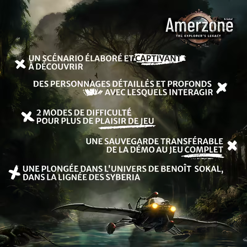 Un voyage qui vous demandera de percer les mystères de “l’hydraflot”, cette fabuleuse invention aussi à l’aise dans l’eau que dans le ciel. Votre seul allié pour triompher des dangers qui se dresseront entre vous et le cœur de l’Amerzone…