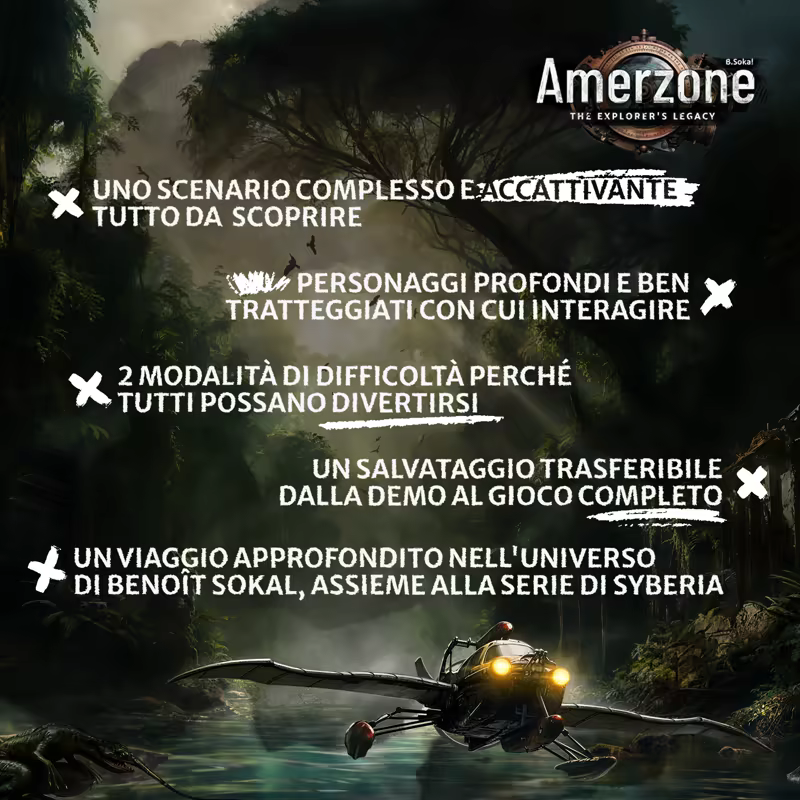 Durante il viaggio sarai chiamato a carpire i segreti dell’“hydraflot”, una fantastica invenzione in grado tanto di navigare, quanto di volare, che sarà l’unico alleato su cui potrai contare per sormontare i pericoli che si ergeranno tra te e il cuore dell’Amerzone…