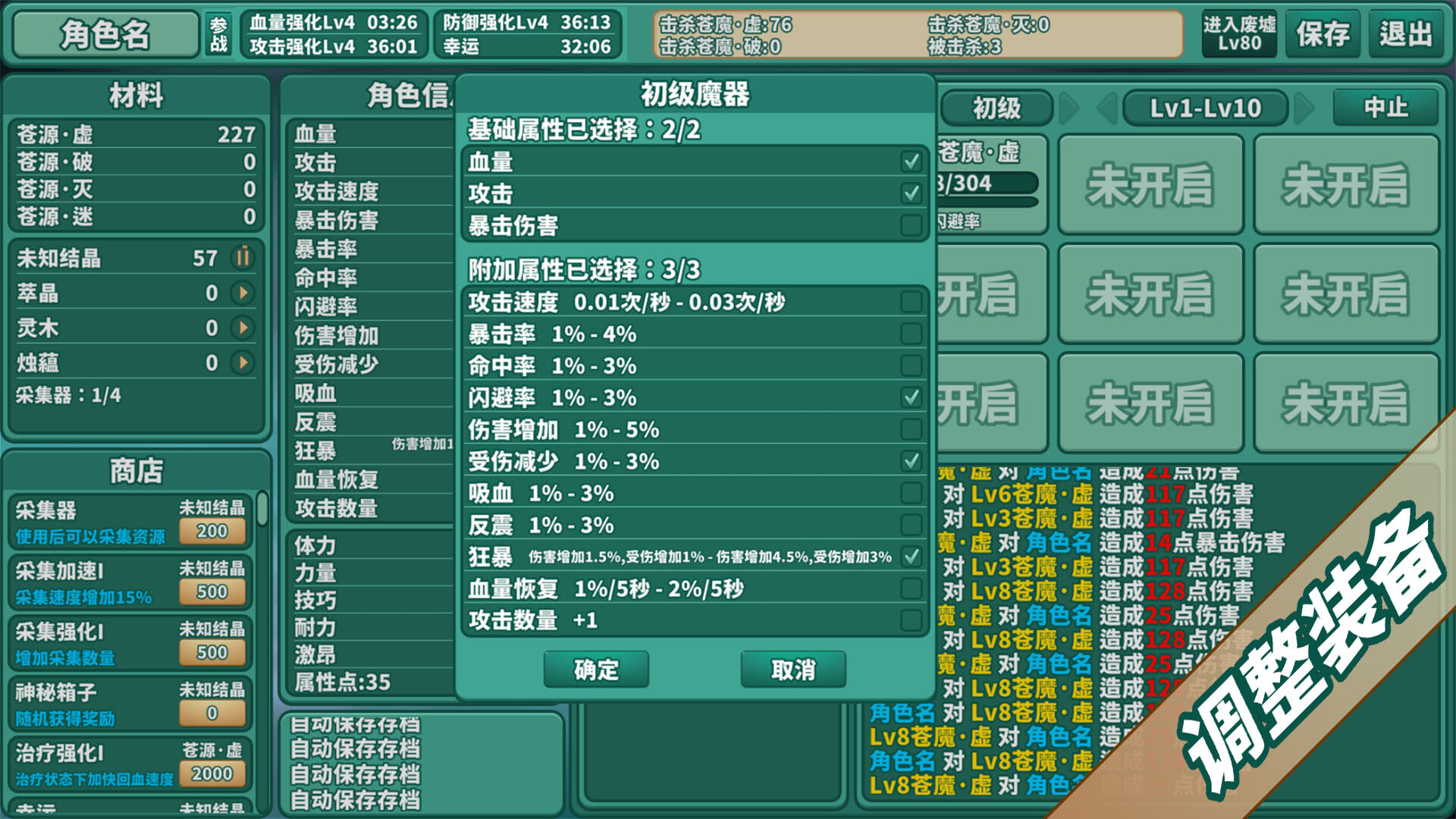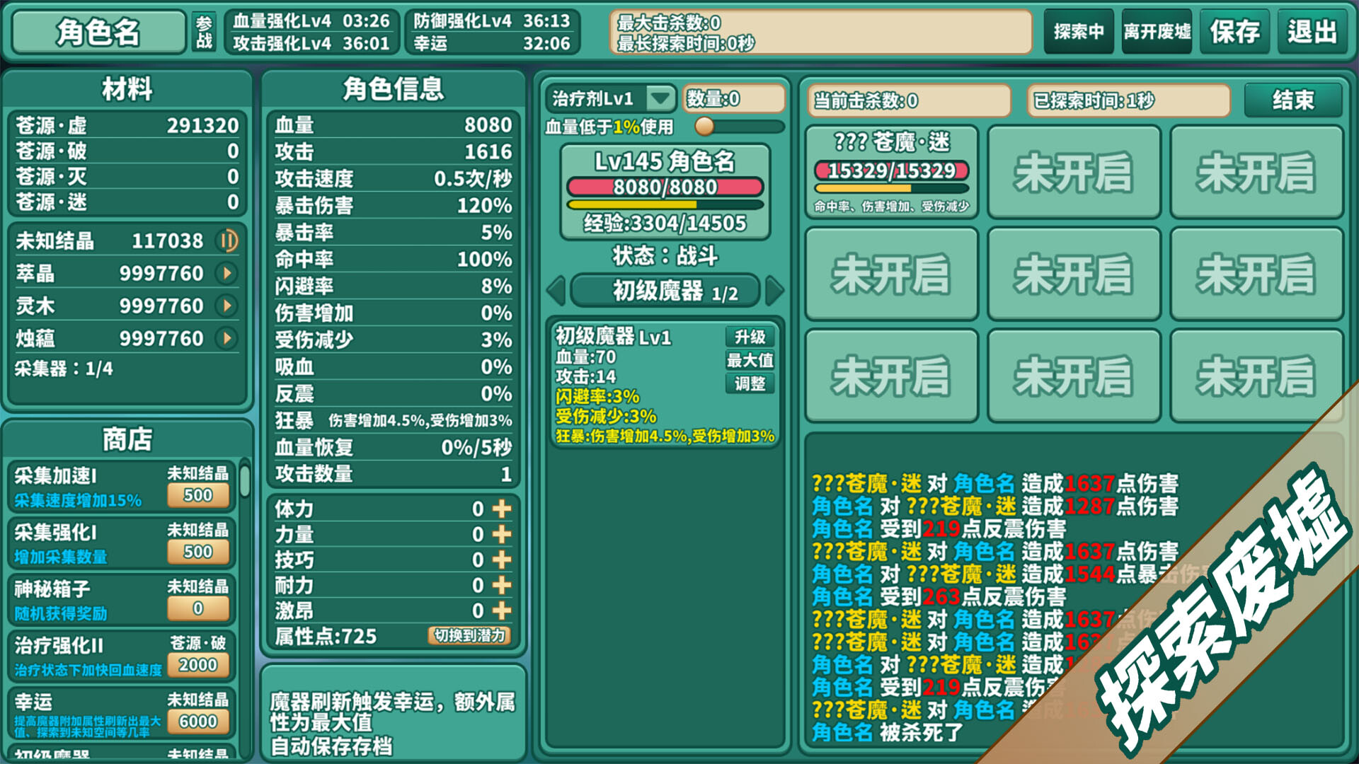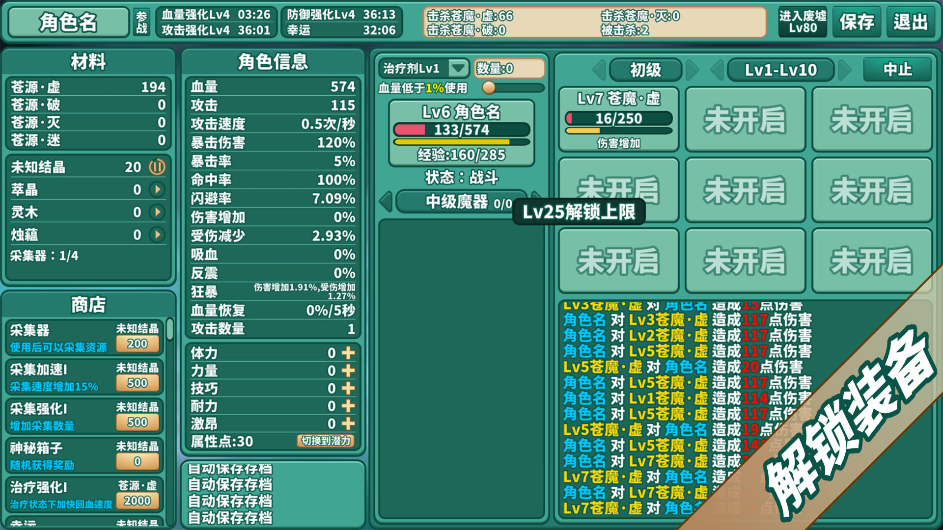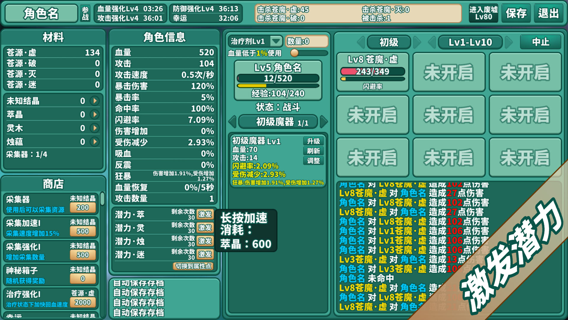 Placement game, free to add points, customize equipment attributes at any time, idle resources in exchange for permanent bonuses to attributes, challenge the limits of survival in the ruins, brave the unknown. You can control your character to get extra resources and abilities