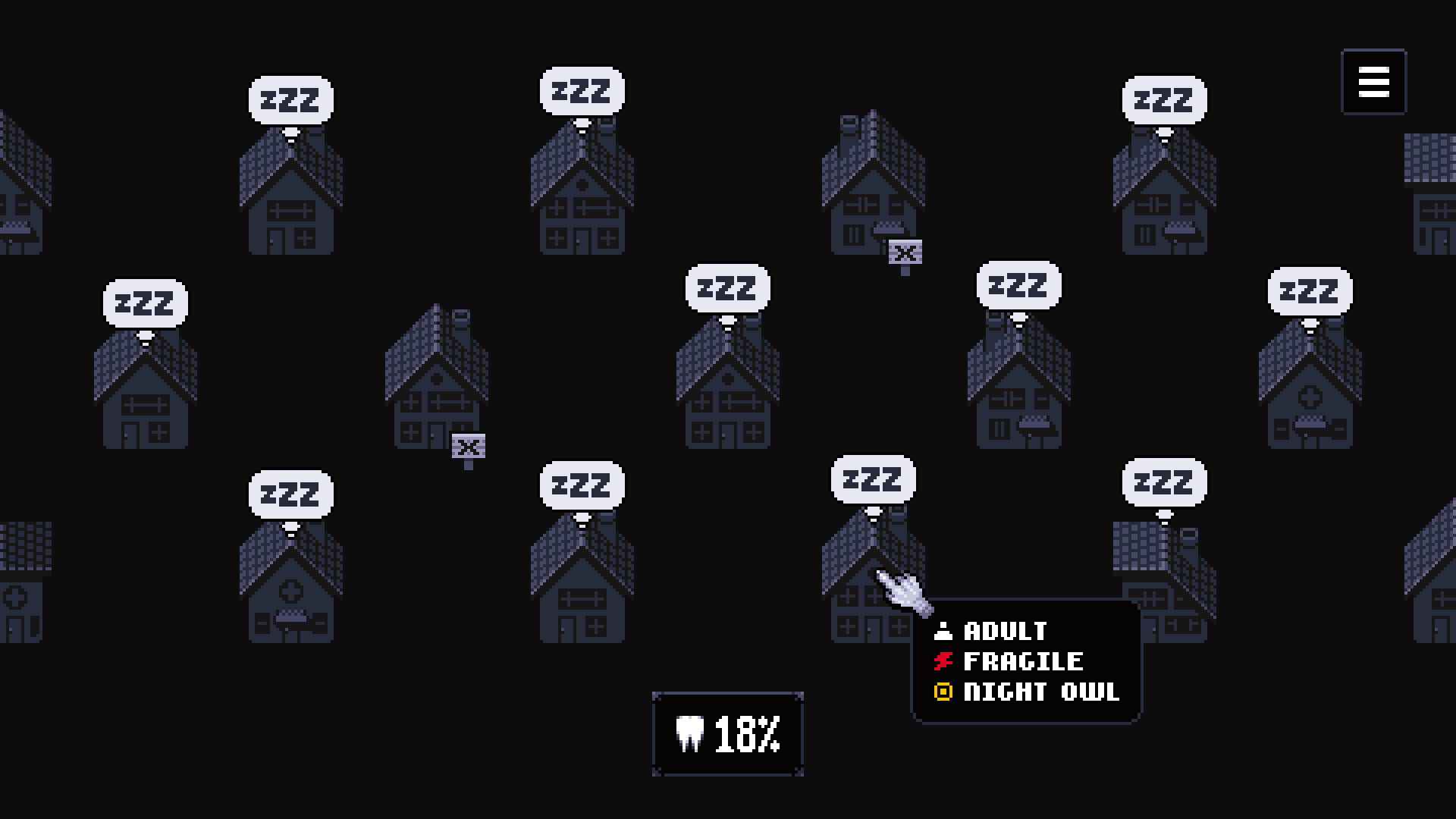 A nightmarish dental simulator where you sneak into townsfolks' homes to steal their teeth. An expanded version of the Ludum Dare 58 game of the same name, made by a solo developer.