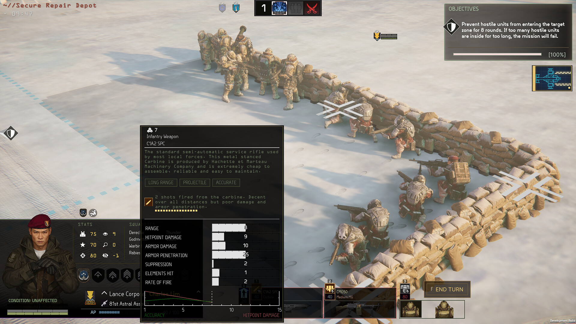 • Keep an eye on your weapons' efficient ranges, their damage over distance, and whether they're best used against heavily or lightly armored enemies. Even beyond accurate ranges, every round fired causes some degree of suppression to the squad it lands next to – whether they were the intended target or not, and whether friend or foe. With heavy fire more likely to pin an enemy down than small arms, you’ll be able to adapt based on the tools at your disposal, but make sure to adjust your approach as needed. Study the enemy to assess if you should be sniping from a distance or aggressively closing the gap under the cover of suppressing fire.