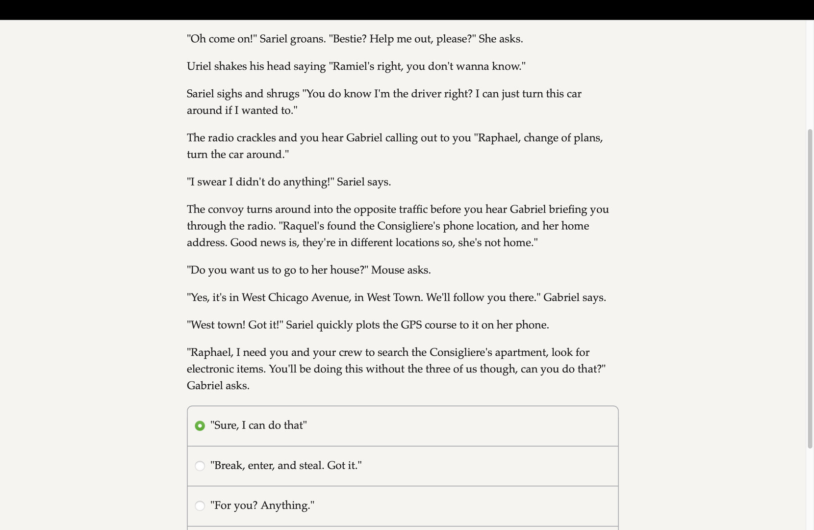 Breach: Chicago War Zone is a thrilling [Word Count (cat * | grep -v "*comment" | wc -w)] word interactive crime novel by Michael Maxwell and Ben Luigi, where your choices control the story. It's entirely text-based—without graphics or sound effects—and fueled by the vast, unstoppable power of your imagination.