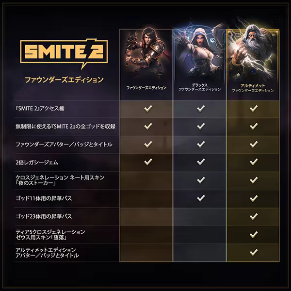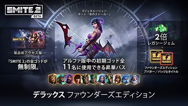 “『SMITE 2』は基本プレイ無料になりました!ファウンダーズエディションを購入せずとも『SMITE 2』をお楽しみいただけますが、こちらは現在もご購入いただけます。”