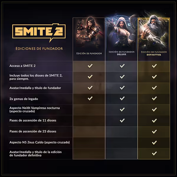 “¡SMITE 2 ya está disponible como juego gratuito! Si bien las ediciones de fundador ya no restringirán el acceso a SMITE 2, seguirán estando disponibles para su compra.”