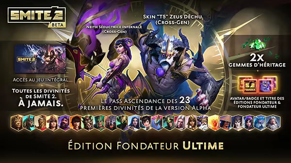 « SMITE 2 est accessible en Free-to-Play ! Il n'est plus nécessaire de posséder une édition Fondateur pour accéder à SMITE 2, mais elles restent disponibles à l'achat. »