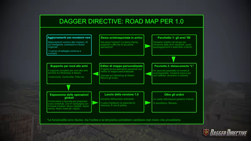 “Nel corso dell'accesso anticipato abbiamo intenzione di aumentare sia la profondità che la personalizzazione del gioco. I nostri progetti comprendono quanto segue.