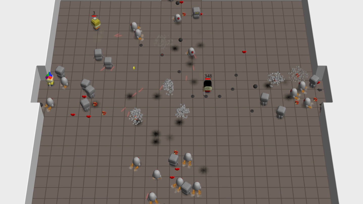 Fast-paced and frenetic. Survive as many hordes of robots as you can using the different weapons available. Play solo or with a friend (local or online cooperative).