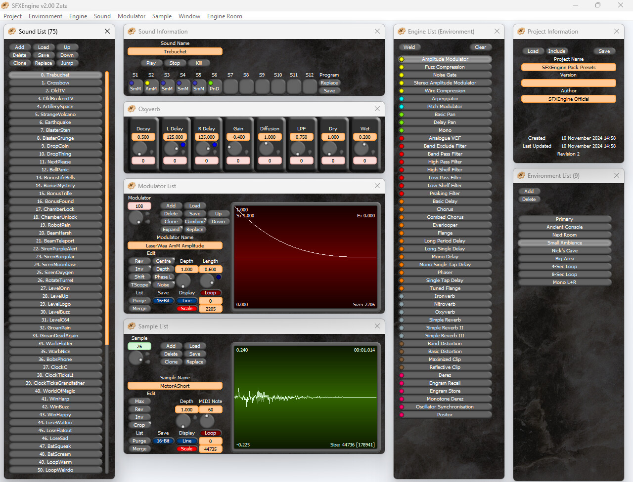 SFXEngine is powerful sound creation software for Windows PC's, one of the first software tools designed to for the creation of sound effects in a modular way. Using a plug-in based synthesis system, you can use SFXEngine to quickly and easily create any sound, or add new audio effects to existing sounds.