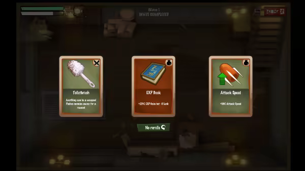After every wave you can select between three cards that can be new weapons, passive items or upgrades to your existing arsenal. Most cards directly influence future selections as the available card pool expands or shrinks into various directions.