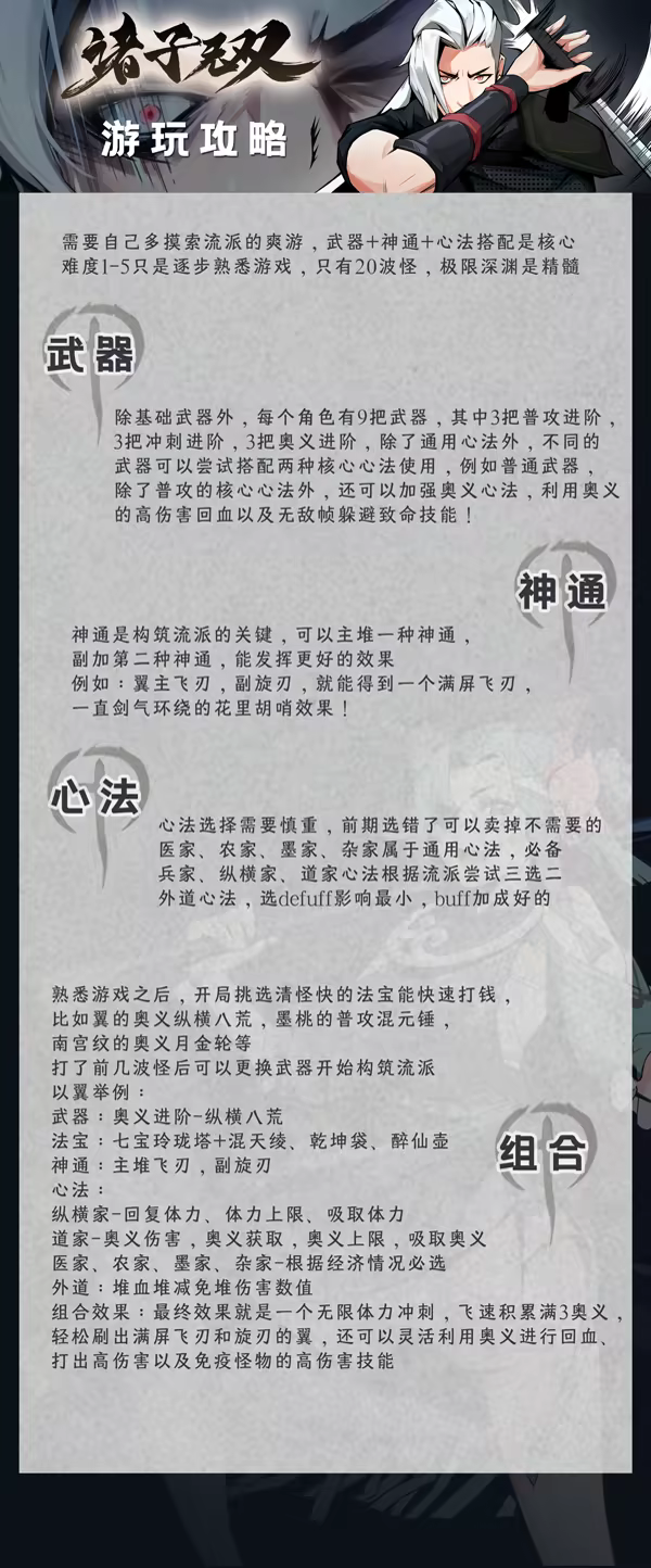 《诸子无双》是一款超爽高速动作肉鸽游戏。多角色选择,数十种武器,搭配秘宝、心法、随机神通、词条等,打造不同流派,构筑独有的Build,对抗魔神鬼煞、魑魅魍魉,疯狂输出,体验暴爽快节奏战斗。还可以领免费的数字艺术设定集。