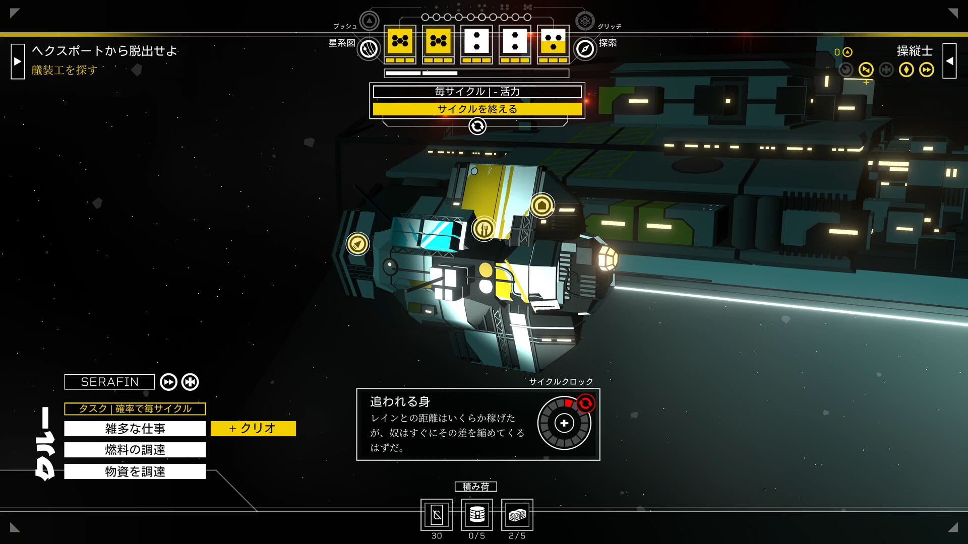 依頼システムが『Citizen Sleeper』のプレイ体験に、新たな没入感と戦術性をもたらす。複数のサイクルにわたる、危険も見返りも大きな仕事をやり遂げるには、入念な準備と、適切なアプローチの選択が欠かせない。それに加えてダイスの出目や、任務中の予想外の展開にも、その場で臨機応変に対処する必要がある。