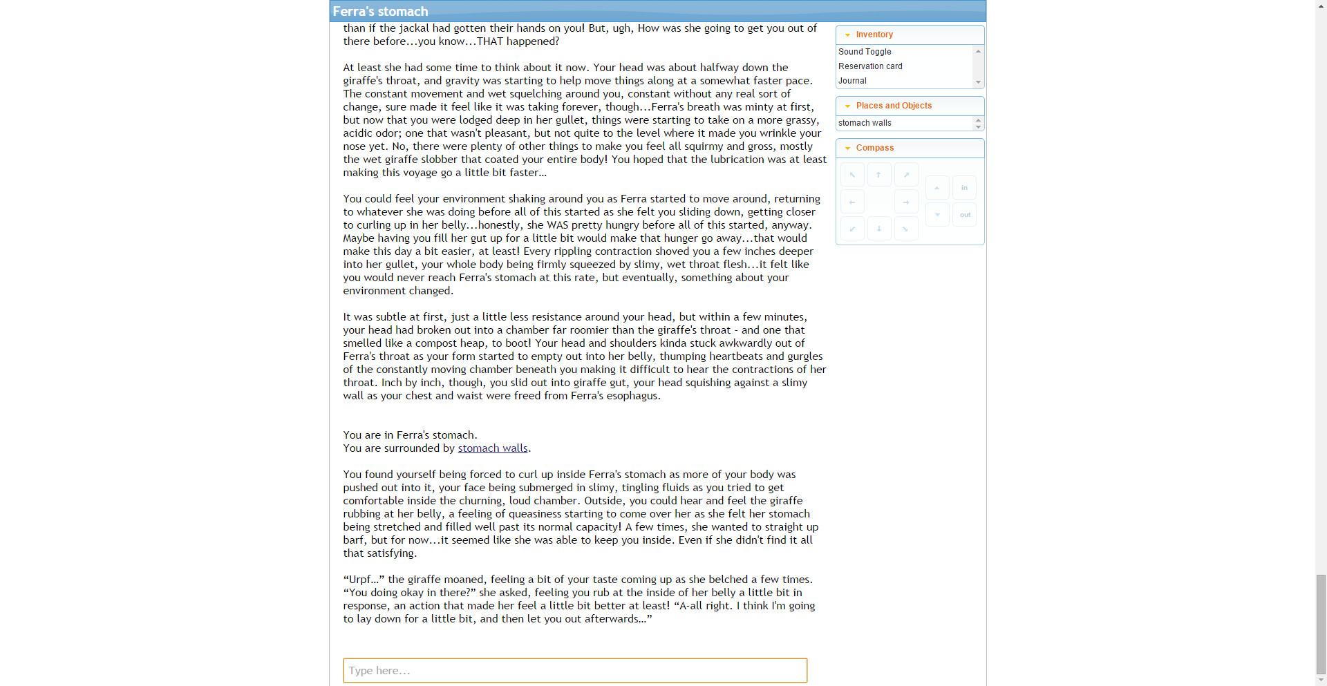 The Hotel is a vore text adventure game. It's got around 350,000 words of content right now, translating to about 50 hours of vorish gameplay! The game primarily focuses on player-as-prey vore. It's mostly same-size, but there is some macro/micro thrown in, as well as a variety of other fetishes!