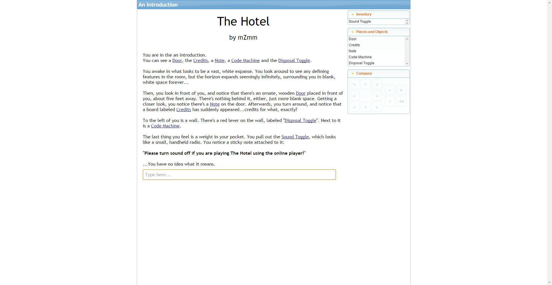 The Hotel is a vore text adventure game. It's got around 350,000 words of content right now, translating to about 50 hours of vorish gameplay! The game primarily focuses on player-as-prey vore. It's mostly same-size, but there is some macro/micro thrown in, as well as a variety of other fetishes!