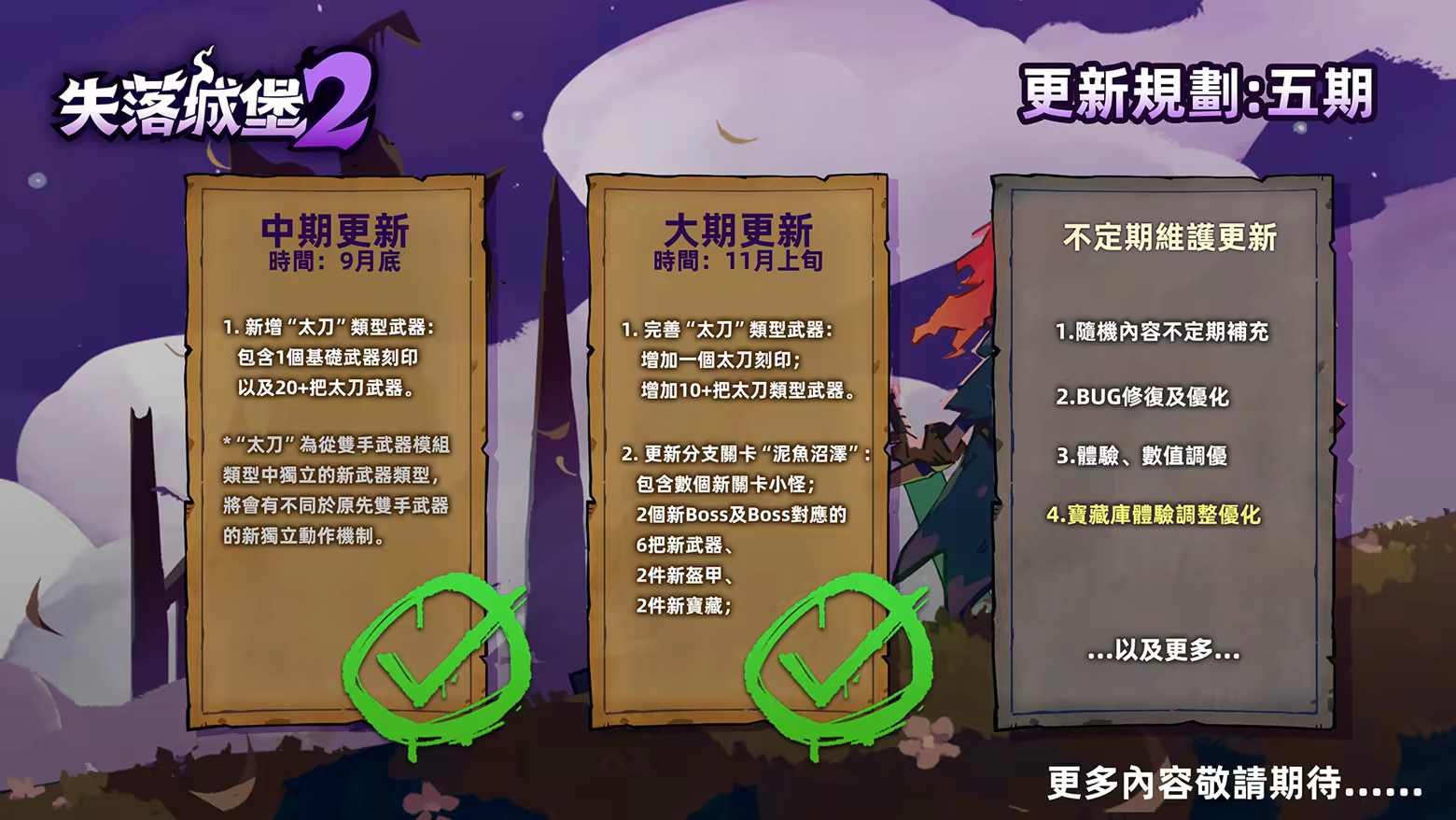 • 我們計畫增加4個額外的分支路線關卡和1個隱藏關卡,每個分支關卡將包含2個新的隨機Boss,隱藏關卡1個Boss