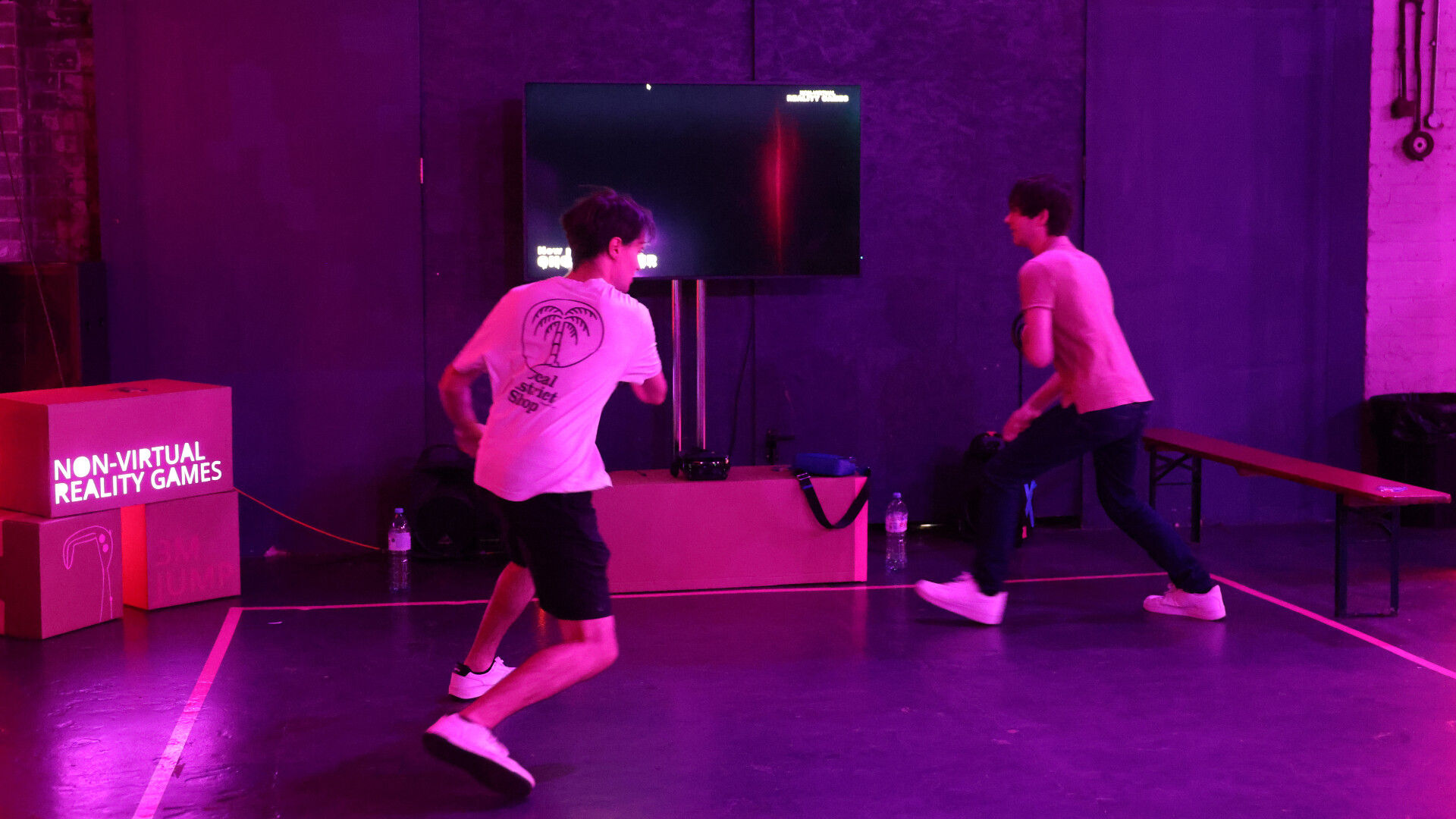 VR without the headset. Games without visuals. Each player gets one of the VR controllers, no headset needed. All included games only use vibrations and sound to convey the game, while you play in the real world.