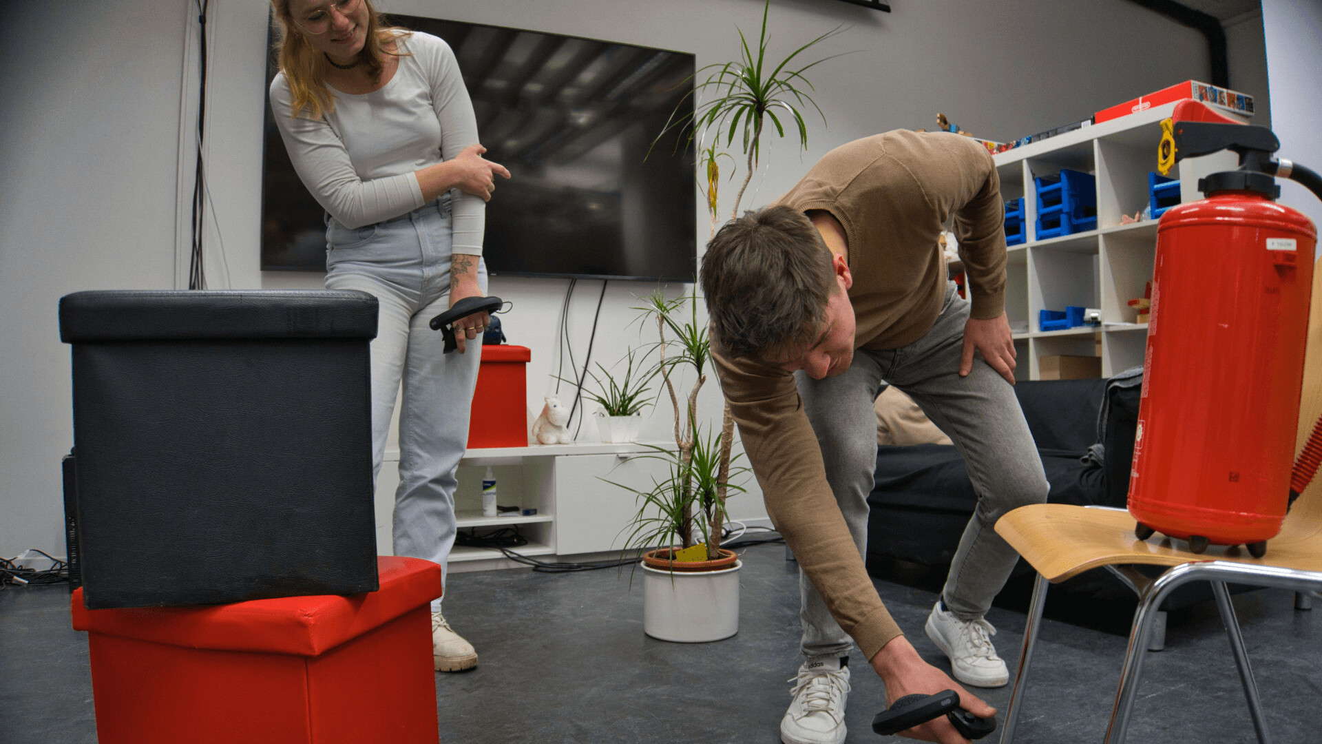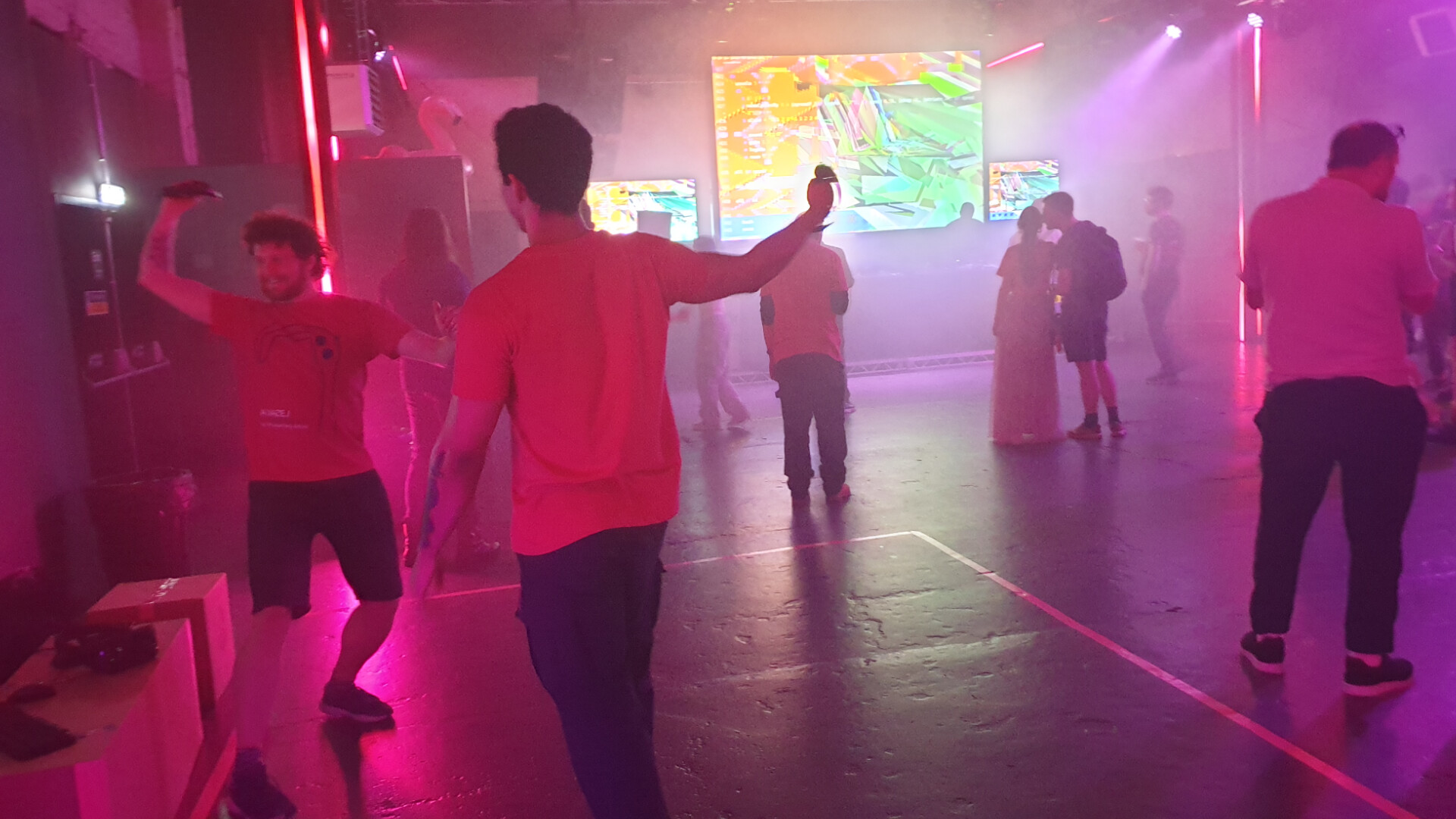 VR without the headset. Games without visuals. Each player gets one of the VR controllers, no headset needed. All included games only use vibrations and sound to convey the game, while you play in the real world.