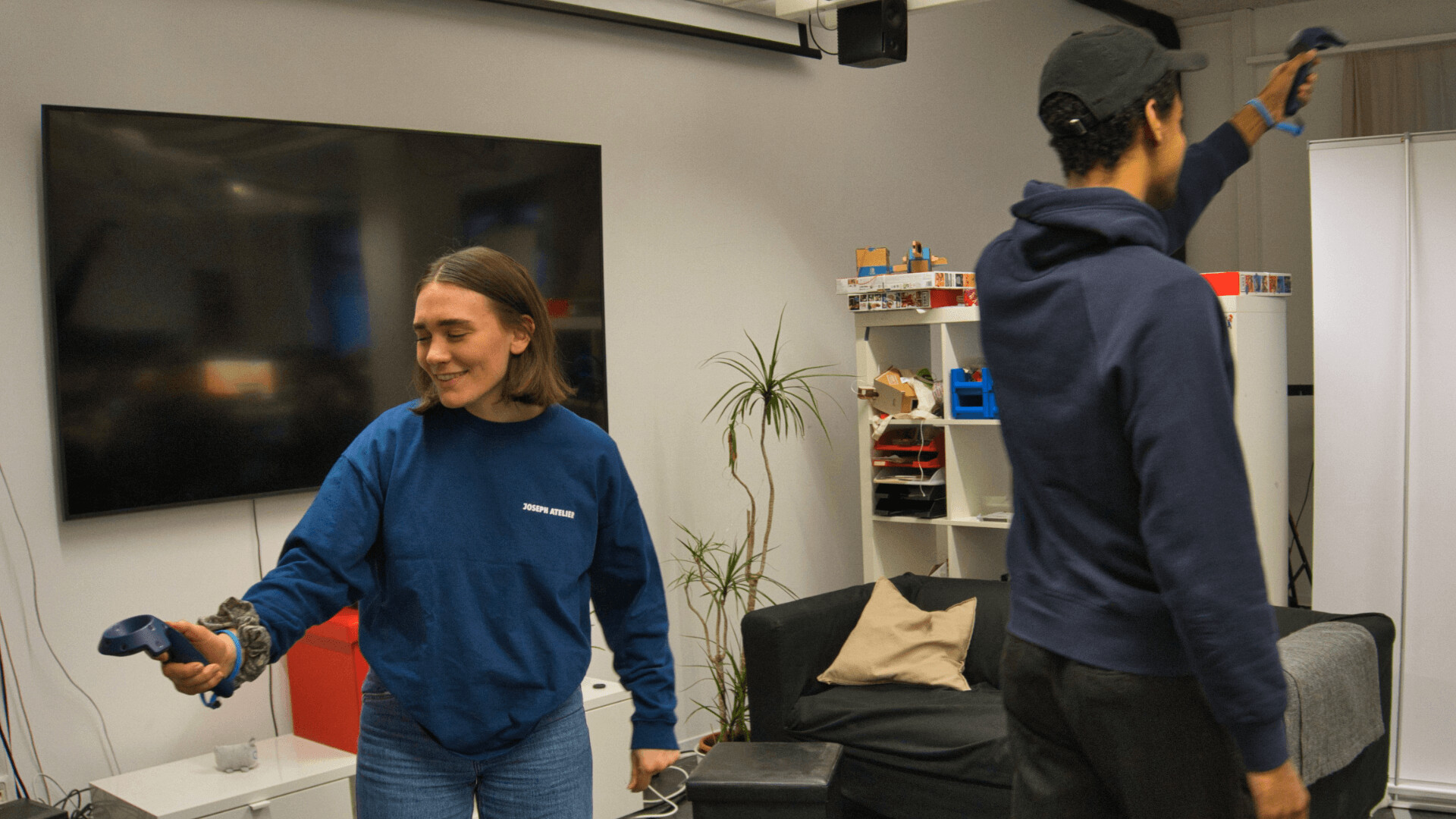 VR without the headset. Games without visuals. Each player gets one of the VR controllers, no headset needed. All included games only use vibrations and sound to convey the game, while you play in the real world.