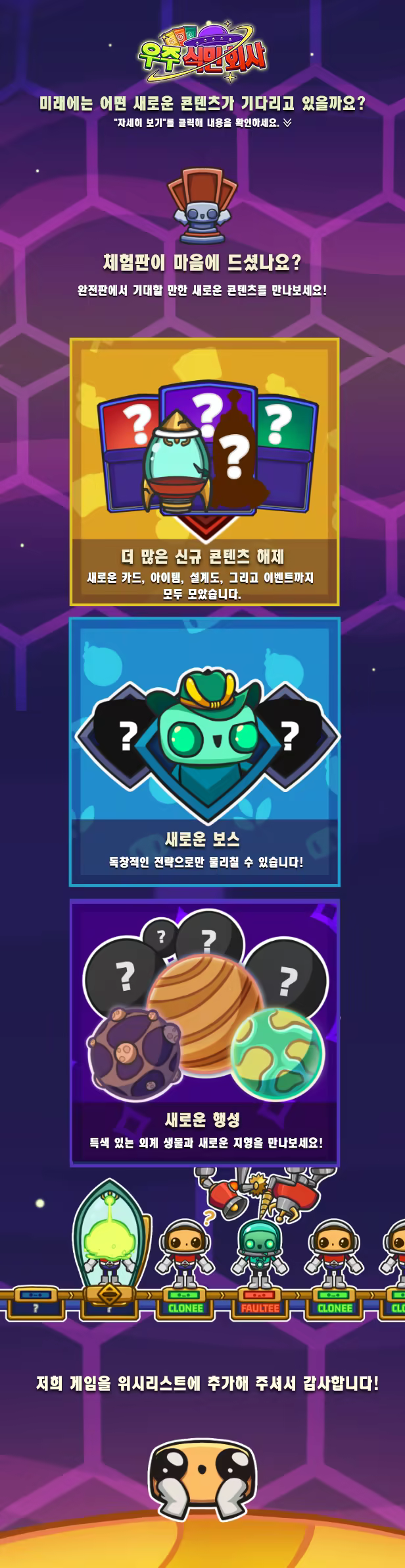 직원을 이끌고 행성을 탐험하세요! 턴제 전투에서 덱을 구성하고 직원을 배치하며, 회사의 무기를 활용해 외계인을 제압하세요. 자원을 약탈하고, 외계 식민 회사 최고의 팀으로 거듭나세요!